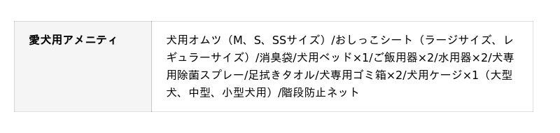 トイレシートや食器、足拭きタオルなど基本的な備品を完備しており、初めてのお泊まりでも安心してご利用いただけます。愛犬との快適な旅をサポートします。