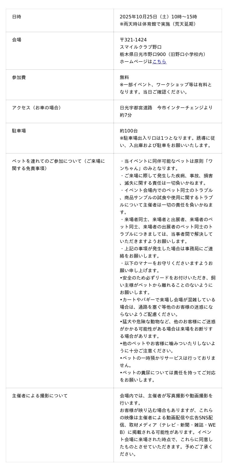 今回、スマイルクラブ野口を運営する株式会社SMYLH様ご協力のもと、本施設にて「ドッグフェスタNIKKO」を開催する運びとなりました。