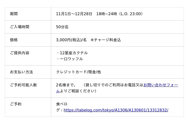 50分/3000円・12星座カクテル(ノンアルコールのモクテルもあり)・一口ワッフル                     ★1日20組様限定★                  飾りは「Merry Christmas」「Congratulations」「Happy birthday」から選択頂けます。