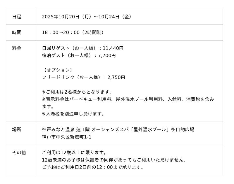 神戸みなと温泉 蓮(総支配人:横山 秀樹、所在地:神戸市中央区)は、10月20日から10月24日まで開催される「みなとHANABI-2025-神戸を彩る5日間」に合わせ、同館自慢の天然温泉に加えて、目の前で上がる花火を屋外温水プールのプールサイドでバーベキューを愉しみながら、特等席で鑑賞いただける「みなとHANABI&BBQ&天然温泉を満喫」オーシャンスパBBQを特別開催いたします。