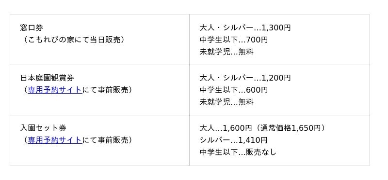 - 公園入園料 大人(高校生以上)450円・シルバー(65歳以上)210円・中学生以下無料