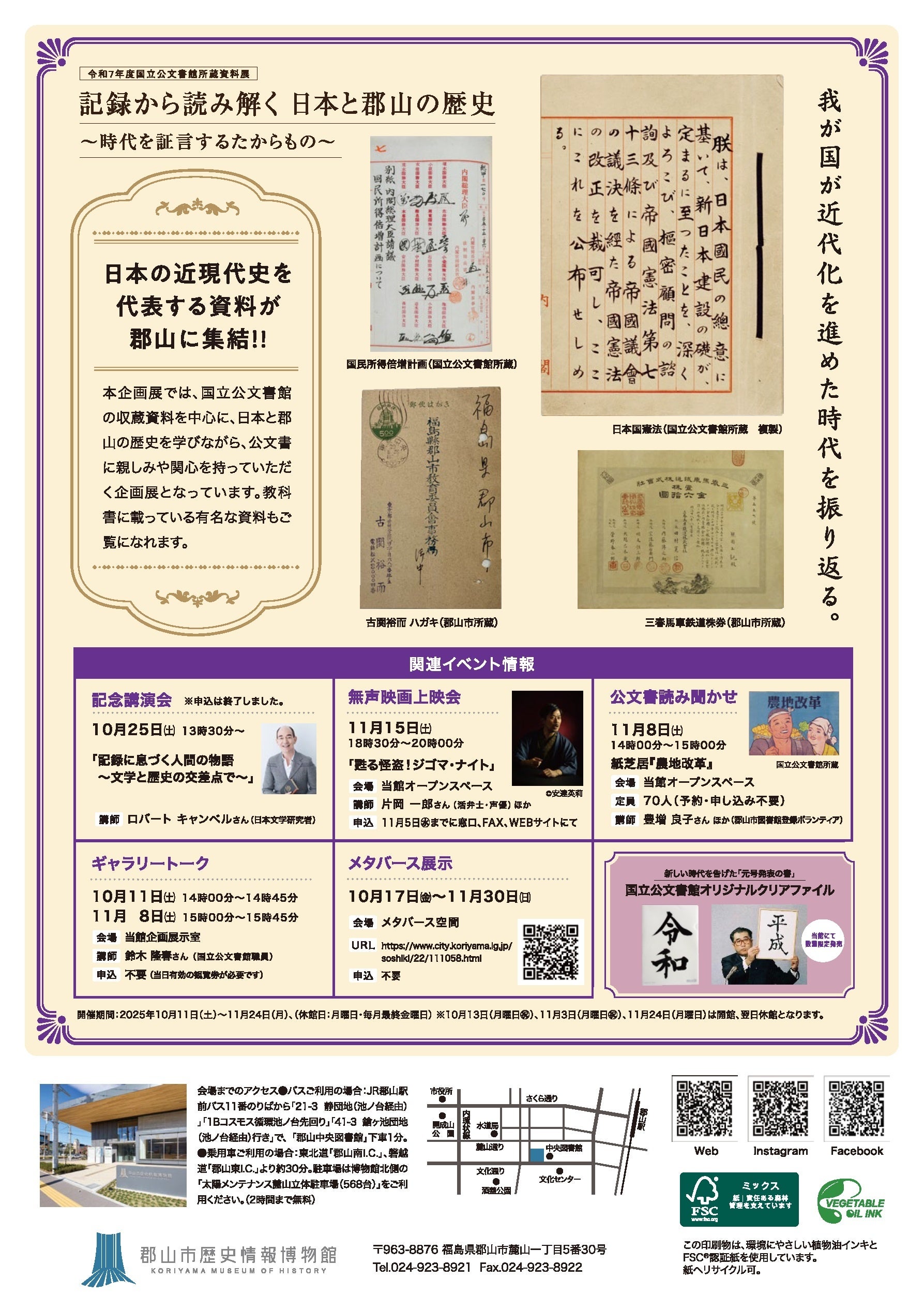 2025年10月11日(土)、国立公文書館所蔵の資料を中心に、近代日本と同時期の郡山の主な出来事を公文書の視点から読み解く企画展が開幕します。