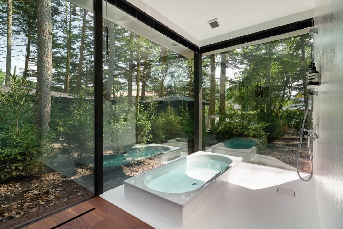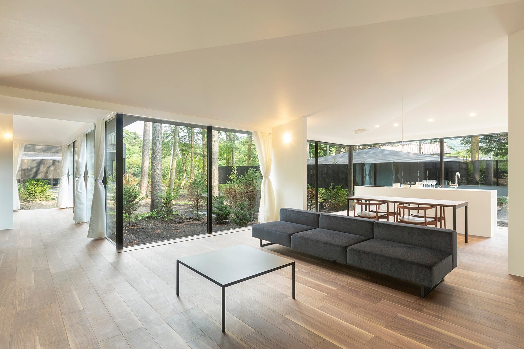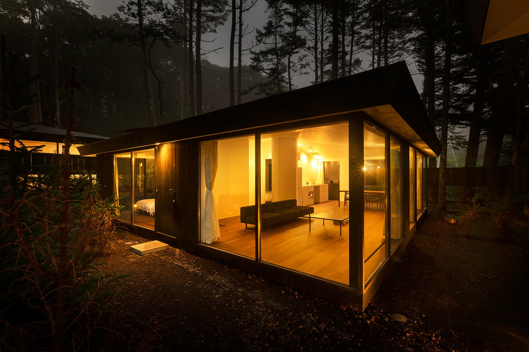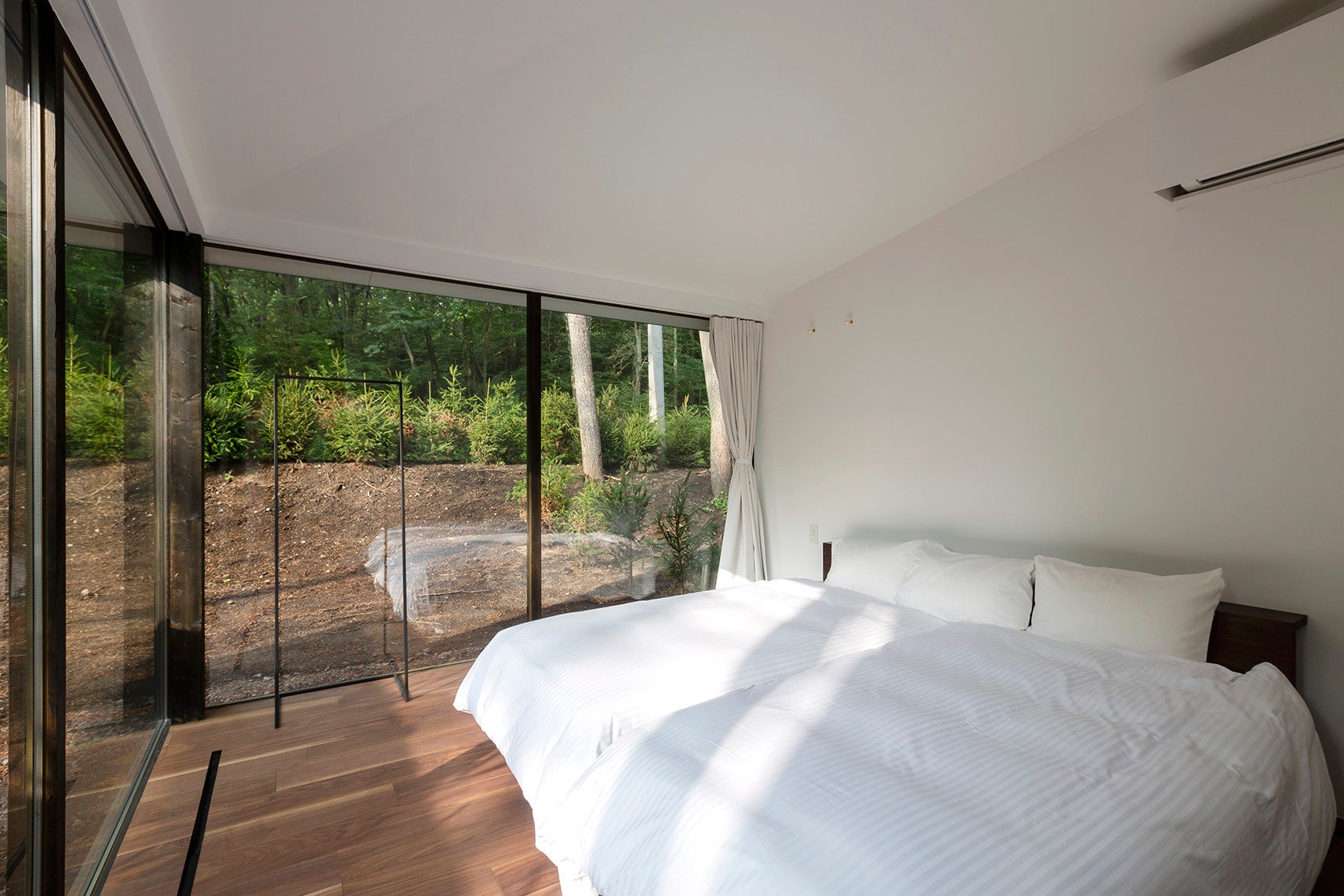 「森の離れ」は、建築事務所TNAが設計を手がけた5棟の独立ヴィラから構成されます。ガラスと木を基調とした建築は、四季の移ろいをそのまま室内に取り込み、自然と建築が一体となる開放的な空間を実現。軽井沢駅から徒歩圏という利便性を持ちながらも、穏やかな森の気配に包まれる、静謐な時間が流れます。