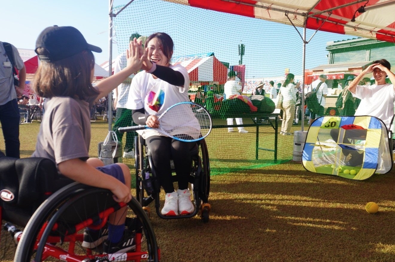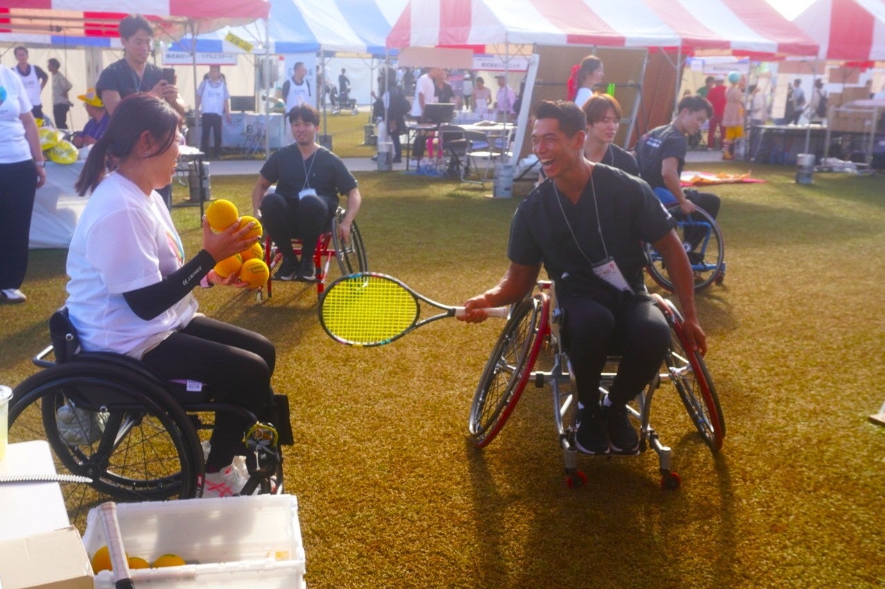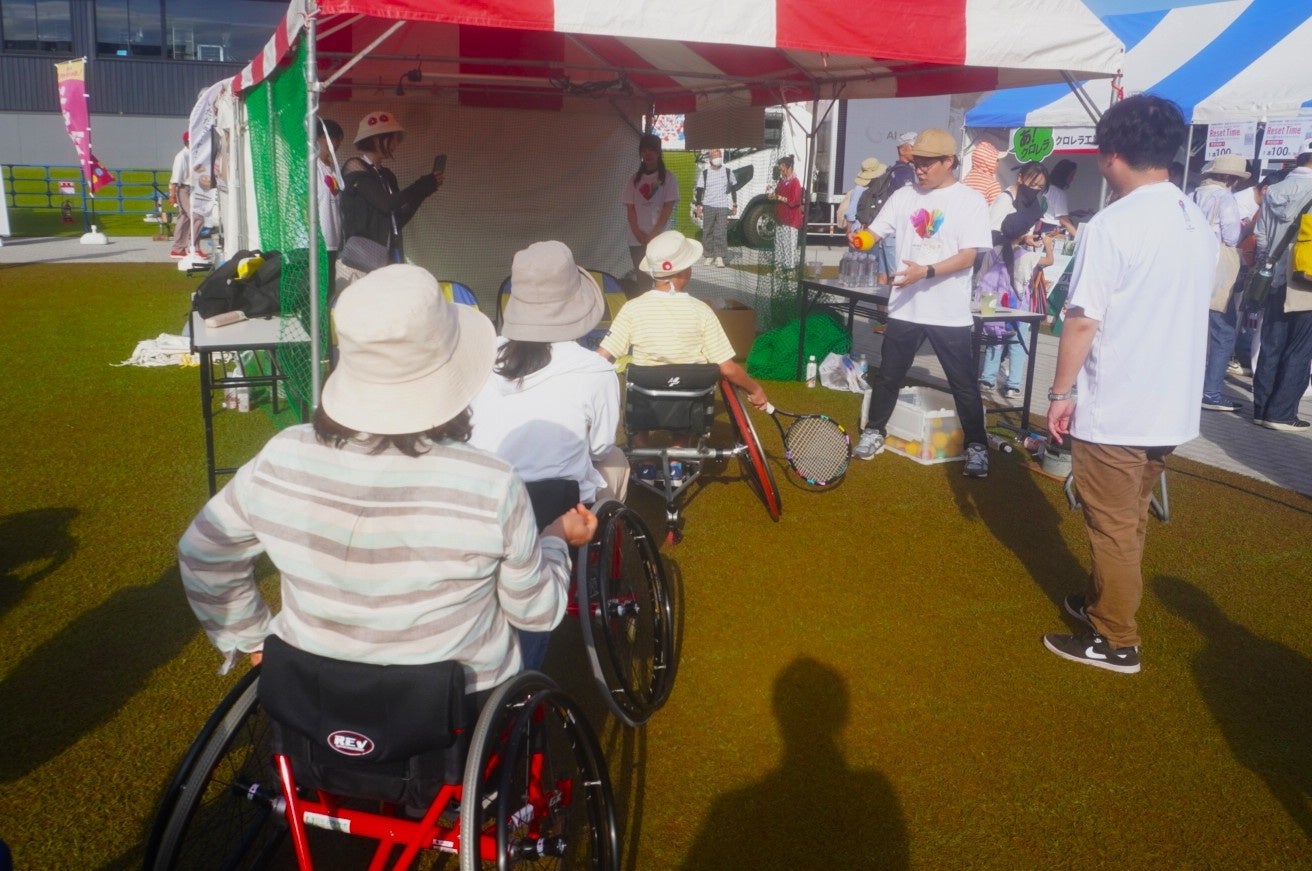 高室は「ストラックアウト de 車いすテニス体験」と題したブースを担当。参加者は競技用車いすに乗り、点数のついた的を狙って打つ体験を通じて、車いすテニスのスピード感や戦術性、チェアワークの魅力に触れました。