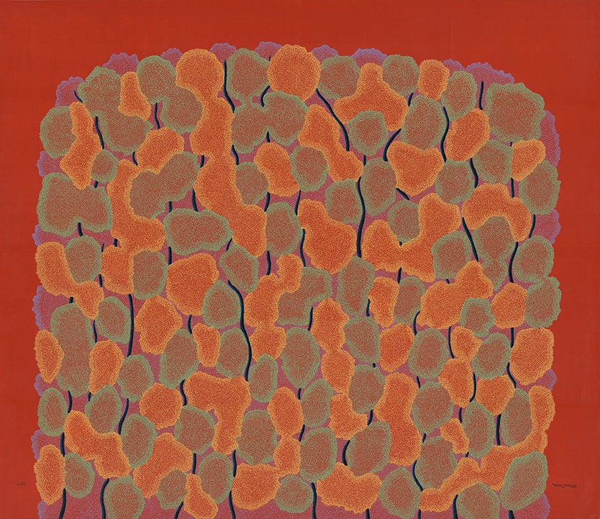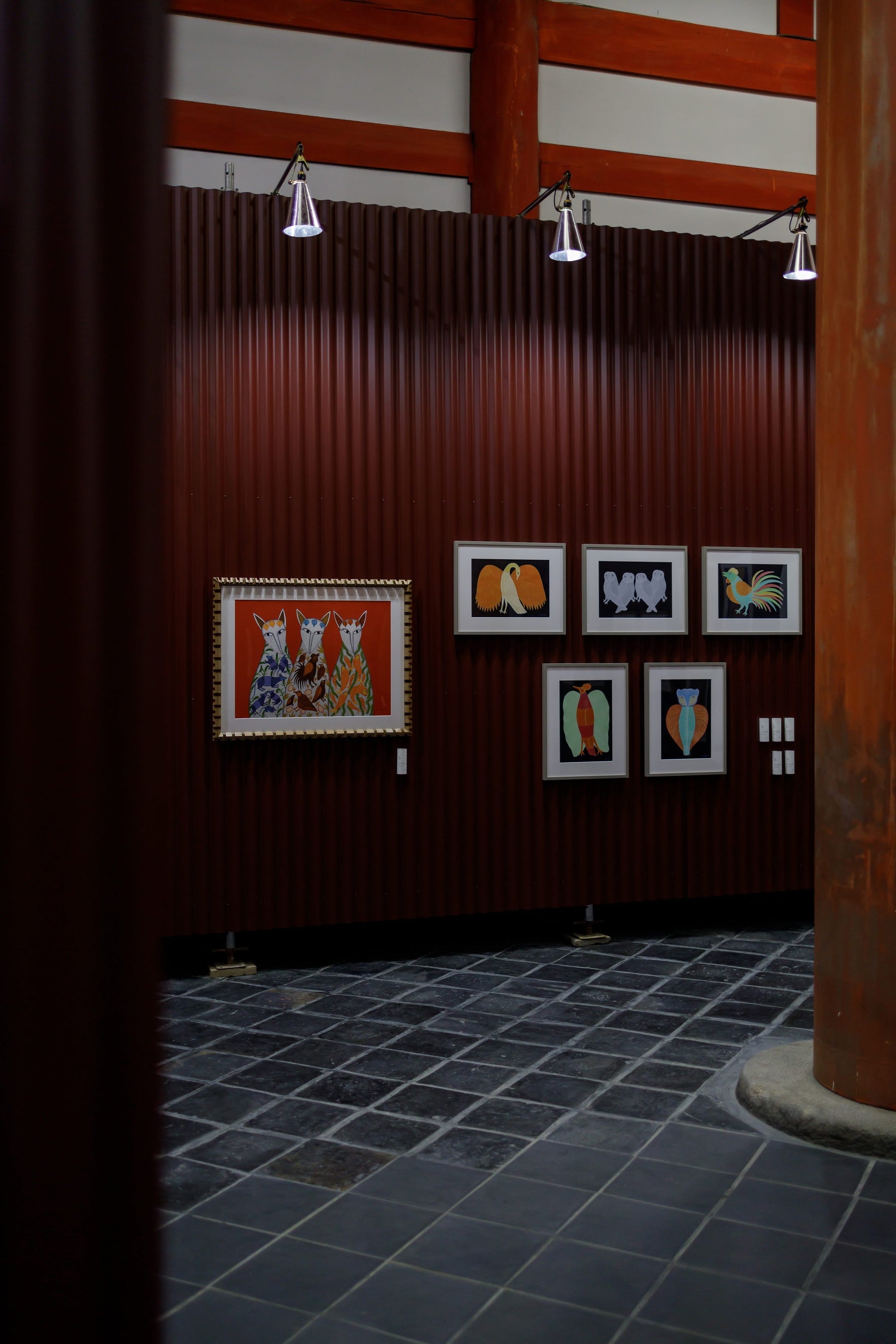 世界遺産・東寺 食堂(じきどう)の荘厳な空間を舞台に、Bhajju Shyamの静謐かつ鮮烈な作品が響き合う展示空間が広がります。空間デザインは、京都を拠点とするデザインファーム NEW DOMAINが担当。東寺の歴史的建築とインドのアートが融和する空間には、生命や自然への祈りが息づいています。