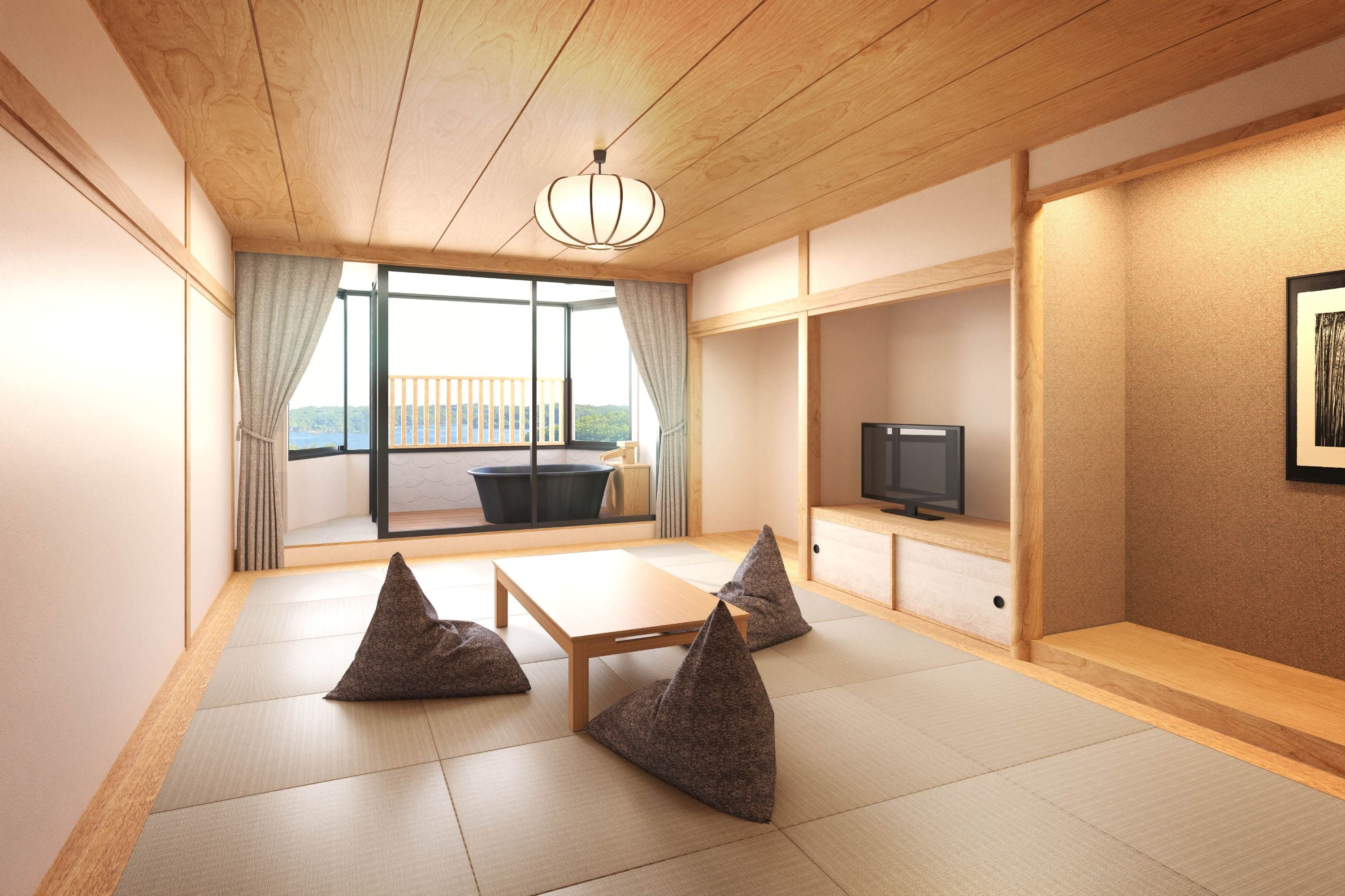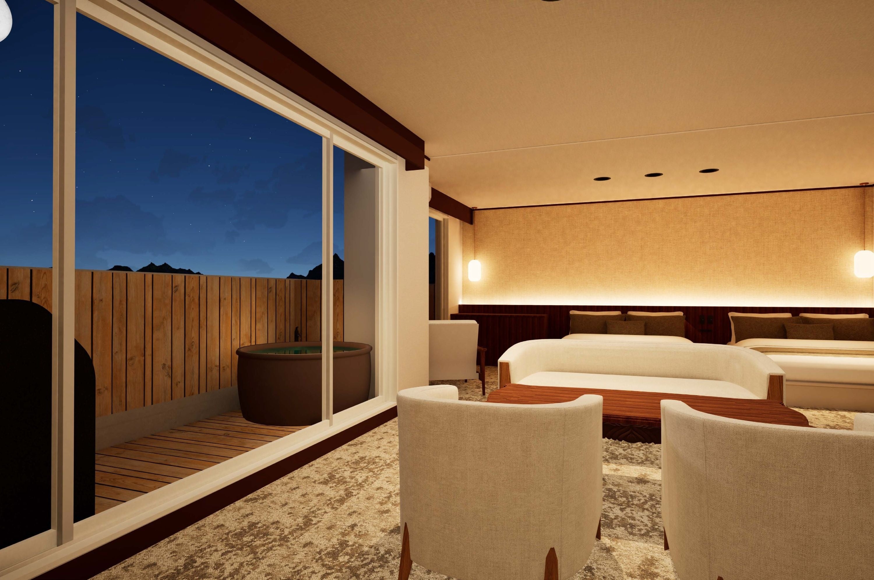 客室の一部を露天風呂付客室へ変更いたします。お部屋でも開放感の味わえる入浴をお楽しみください。また、ベッドタイプの客室も追加いたします。お子様連れにうれしいキッズスペース付客室も新たに登場いたします。気軽にキャンプ泊が楽しめるグランピングエリアルームもあり、多彩な客室からご利用シーンに合わせお選びいただけます。・露天風呂付客室:8室