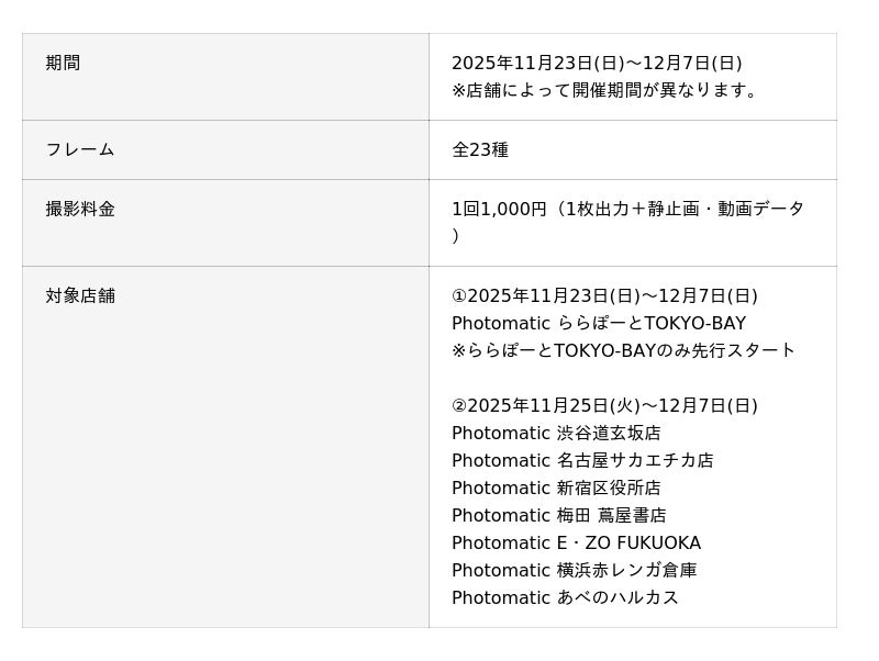 キタムラ・ホールディングス グループのピックハイブ株式会社(本社:東京都新宿区、代表取締役社長 兼 COO:大迫 由典)が運営するセルフフォトブランド「Photomatic(フォトマティック)」は、11月23日(日)から人気VTuberグループ「ぶいすぽっ!」と初のコラボレーションを実施いたします。このコラボレーションは、LaLa arena TOKYO-BAYで実施される「ぶいすぽっ!フェス 2025」の開催に合わせ、イベント会場近隣のPhotomatic ららぽーとTOKYO-BAYでの11月23日(日)からの先行展開を皮切りに、全国の9カ所のPhotomaticで期間限定で展開。ぜひお近くのフォトブースで、ぶいすぽっ!メンバー23名との記念の1枚の撮影をお楽しみください。