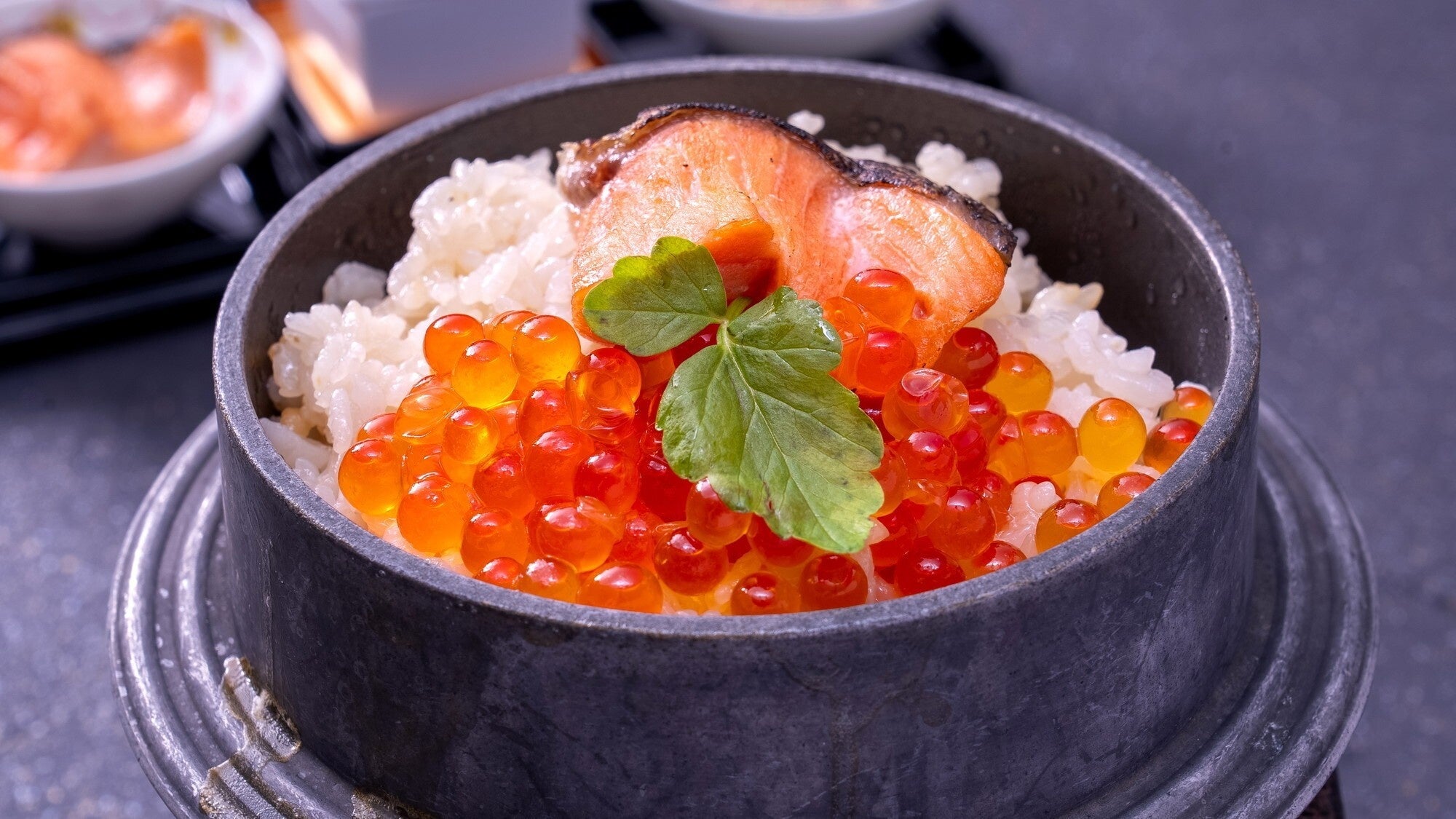 蔵王サーモンといくらのはらこ飯お料理の〆には『古窯名物窯めし』をお楽しみください。今回は希少なご当地品種である蔵王サーモンといくらのはらこ飯です。蔵王サーモンは脂の乗りが良く、甘みと旨味が豊富です。