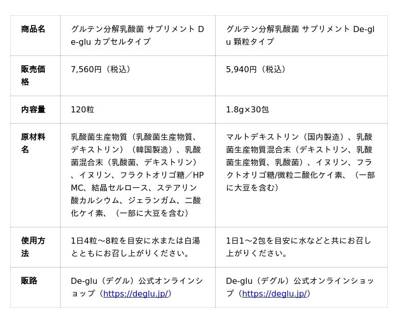 「De-glu(デグル)」は、韓国の伝統的な発酵食品から発見・開発された最大約70%のグルテン分解機能を持つ乳酸菌(※1)を配合した自社ブランドのサプリメントです。幅広いシーンでご使用いただけるよう、カプセルタイプと顆粒タイプの2種で展開しています。カプセルタイプは1日4粒を目安に、2~3回に分けて食後に飲むことを推奨しています。顆粒タイプは1日1包を目安に、食中もしくは食後に飲むことを推奨しています。水などの飲み物に混ぜると効果的に摂取することができるのでおすすめです。