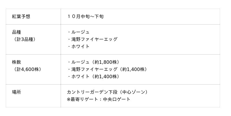今年は紅葉しない品種「ホワイト」が初登場。他の品種との色の違いにも注目して見てください。