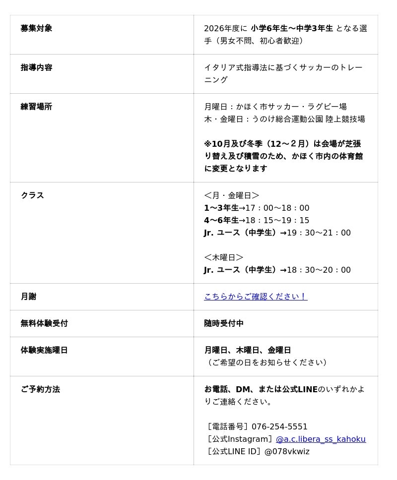 合同会社G.I.Libera(本社:石川県かほく市、代表:池島範彦)が運営する、サッカースクール「A.C.Libera(エーシー・リーベラ)」は、小学6年生~中学3年生を対象とした2026年度の新入団選手募集を開始いたしました。