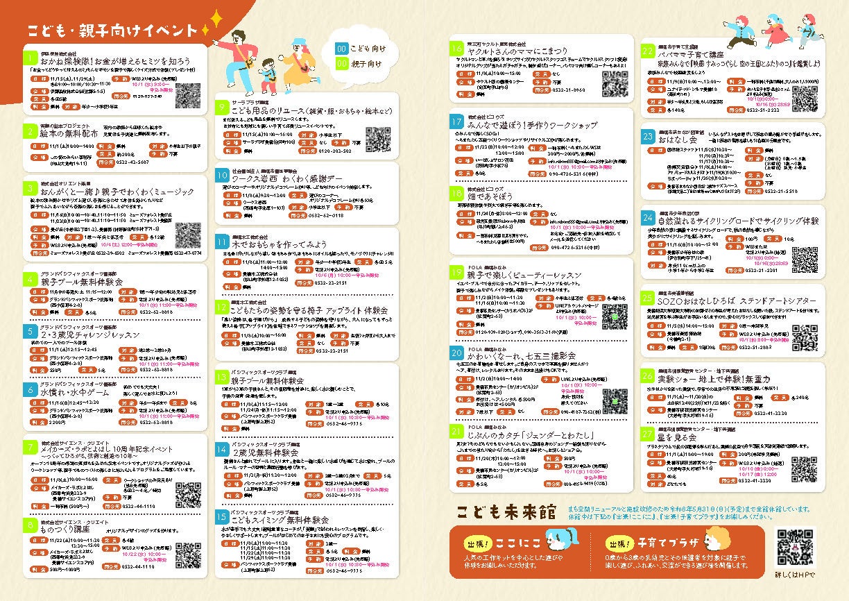 予約が必要な企画もあるので、ホームページ(HP)やパンフレットをご確認ください。なお、今年は市こども未来館ここにこでの1DAYイベントは、施設改修中につき開催いたしません。