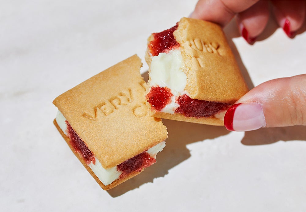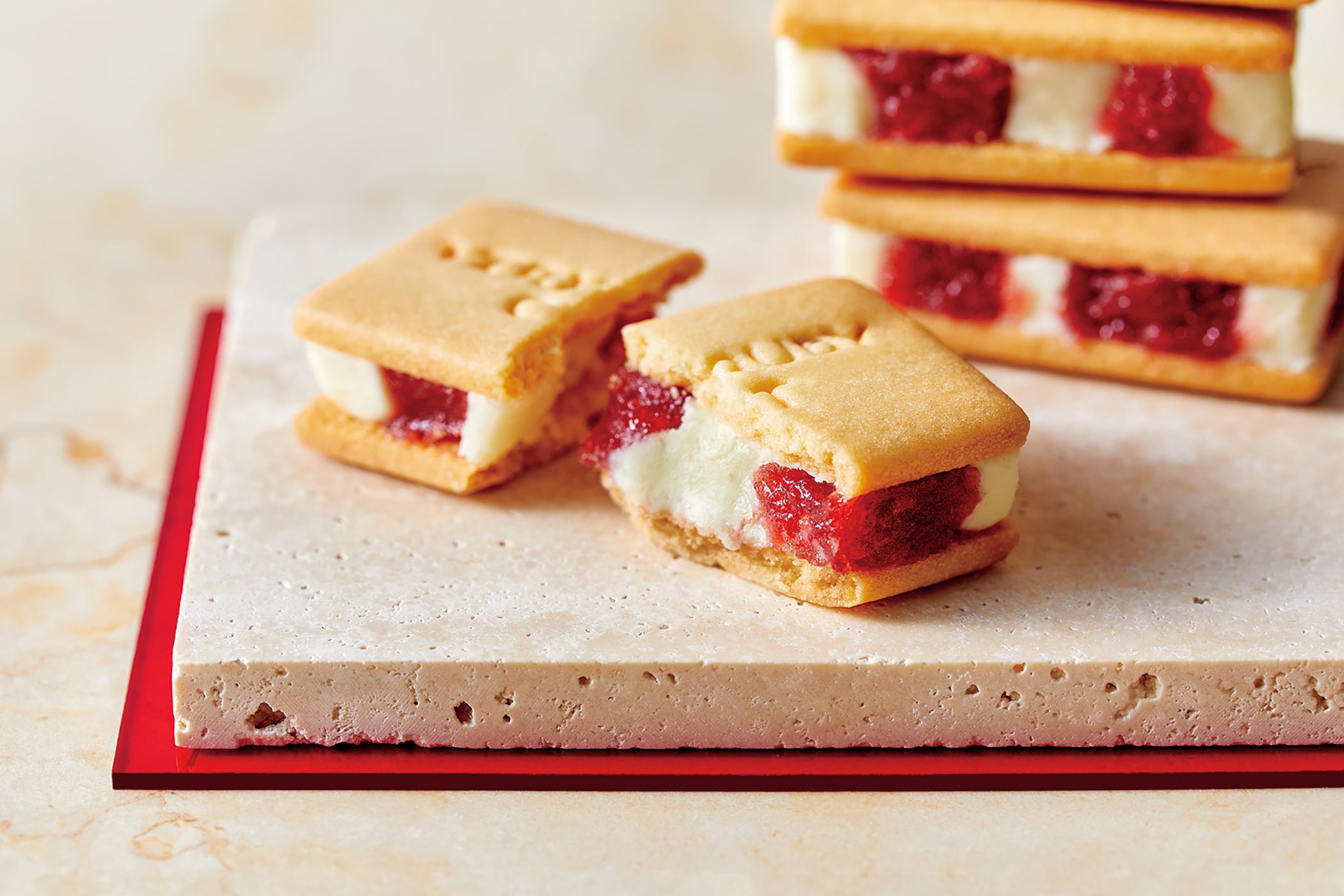 真っ赤な果肉と香り高い甘さが特徴の“イタリア産サブリナ苺”をとろっと煮詰めたコンフィチュールと、練乳ミルクのコクをなめらかに練り上げたホワイトショコラ。ふたつが柔らかなまま合わさった“とろけるダブルメルト製法”の生み出す美味しさを、しっとりしたクッキーでサンドしました。