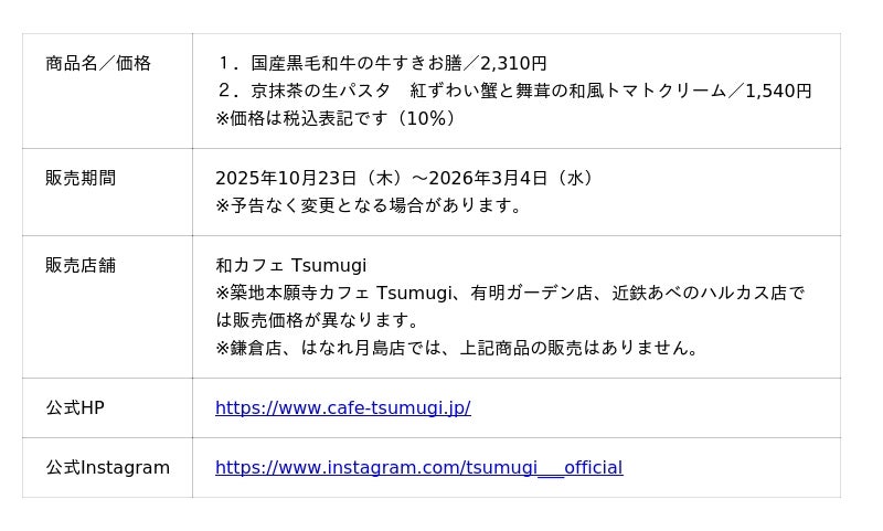 飲食チェーン「PRONTO(プロント)」を展開する株式会社プロントコーポレーション(本社:東京都港区、代表取締役社長:杉山和弘)は、『和カフェ Tsumugi(以下、ツムギ)』にて、「国産黒毛和牛の牛すきお膳」と「京抹茶の生パスタ 紅ずわい蟹と舞茸の和風トマトクリーム」を2025年10月23日(木)より発売いたします。