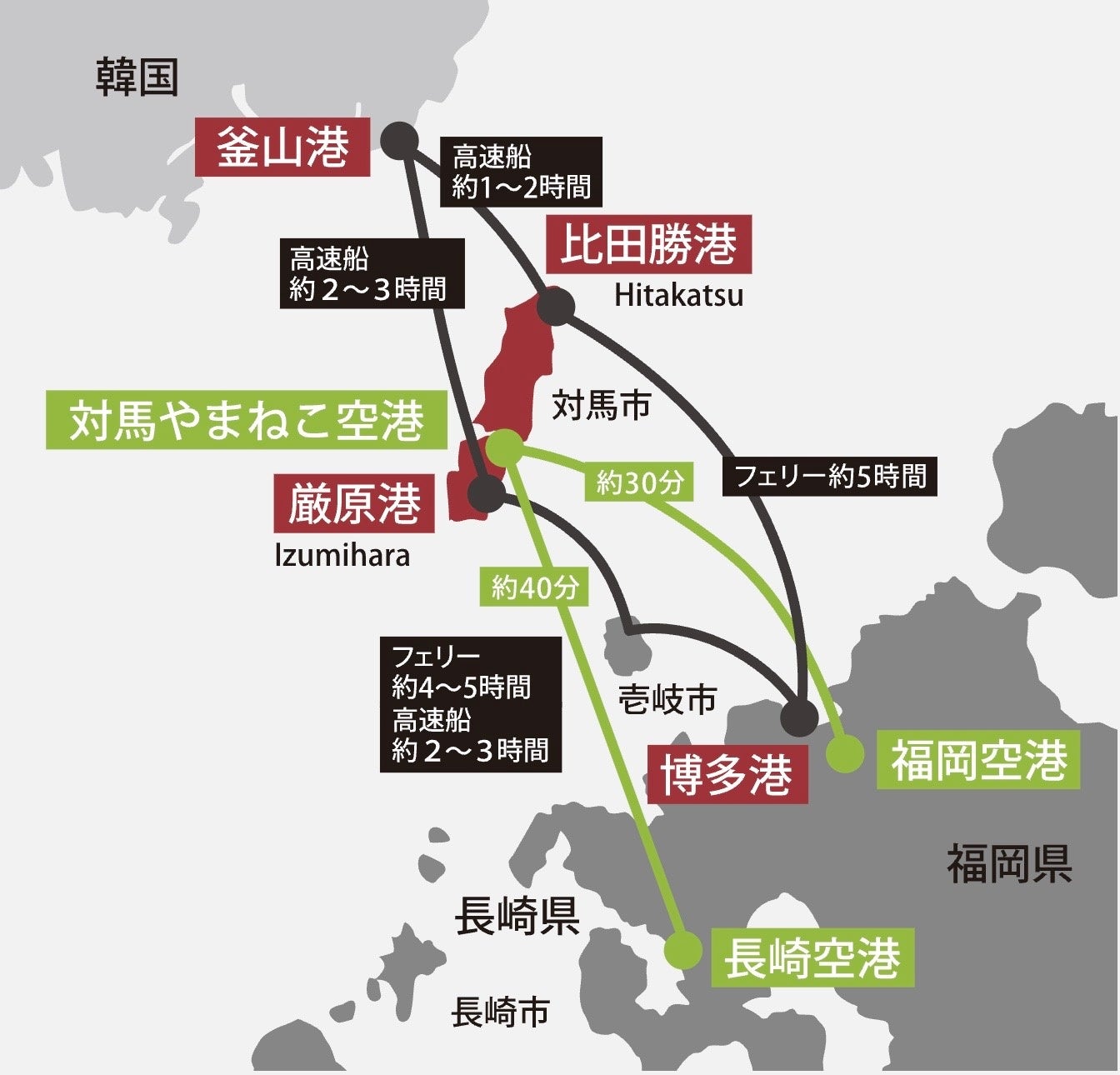 対馬は博多から飛行機で30分、高速船で2時間15分、また、釜山から高速船で約1時間半でアクセス可能で、韓国との二拠点旅行(釜山+対馬)を想定した利用にも最適です。