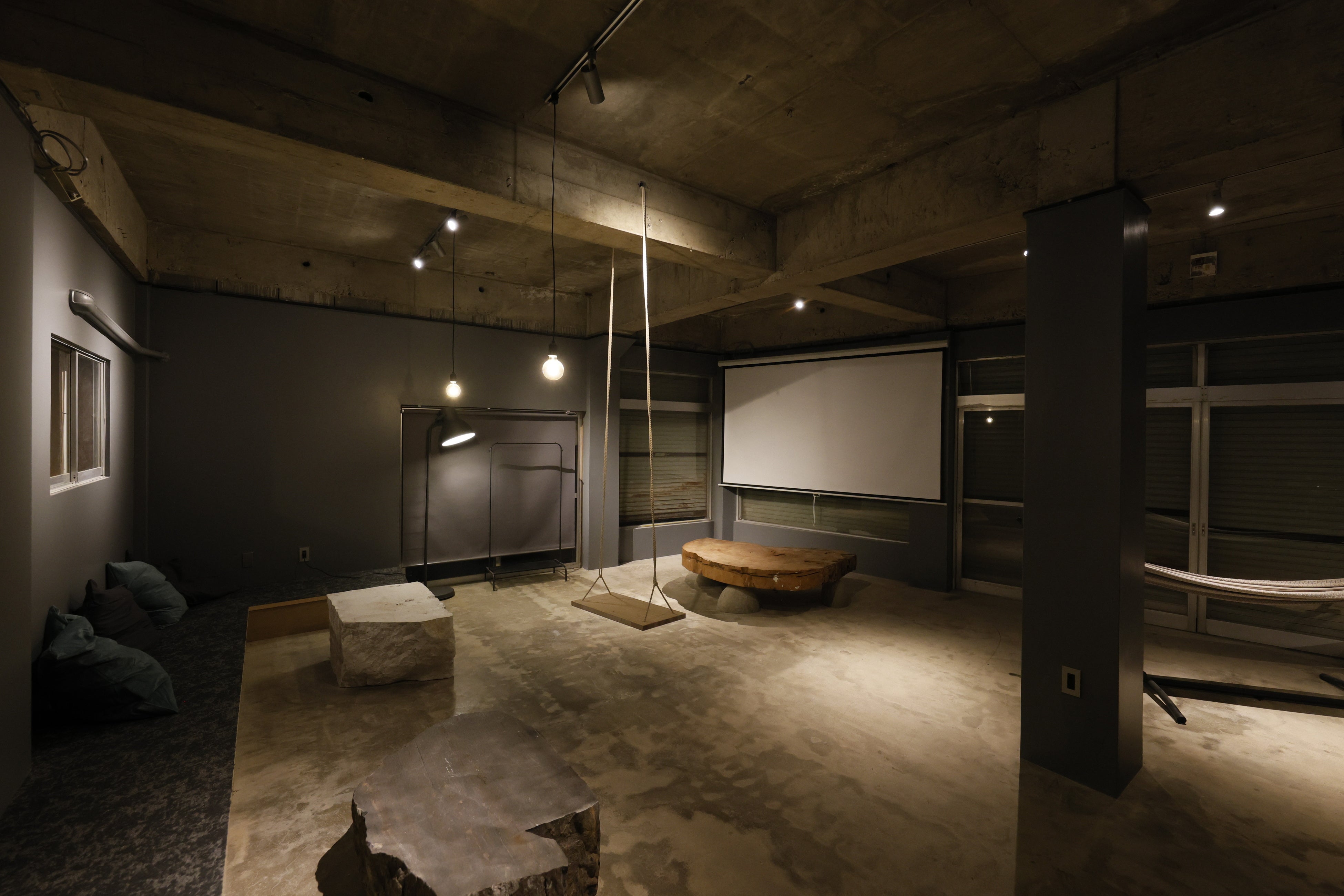 - 土間リビングスペース 土間を利用した広々としたダイニング及びリビングスペース。120インチの大スクリーンで映画を鑑賞することもできます。
