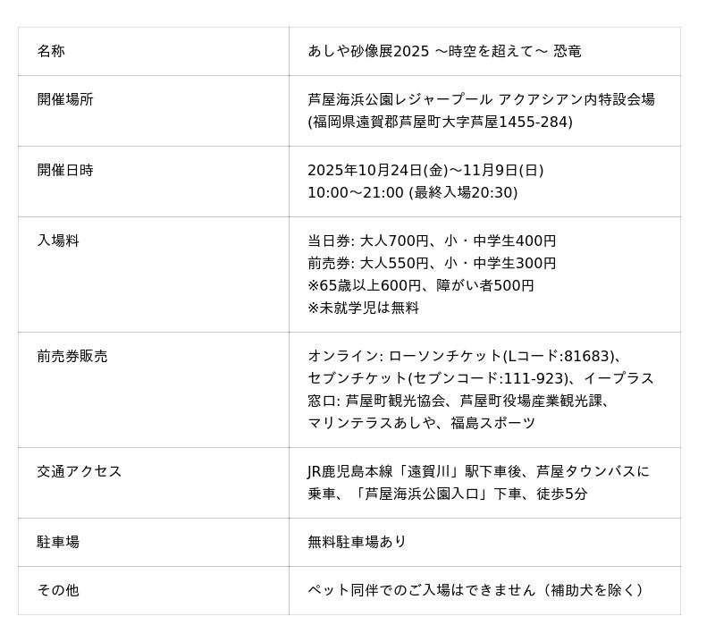 福岡県芦屋町のあしや砂像展実行委員会(構成団体:一般社団法人芦屋町観光協会他)は、2025年10月24日(金)から11月9日(日)までの17日間、芦屋海浜公園レジャープールアクアシアン内の特設会場にて、『あしや砂像展2025』を開催します。