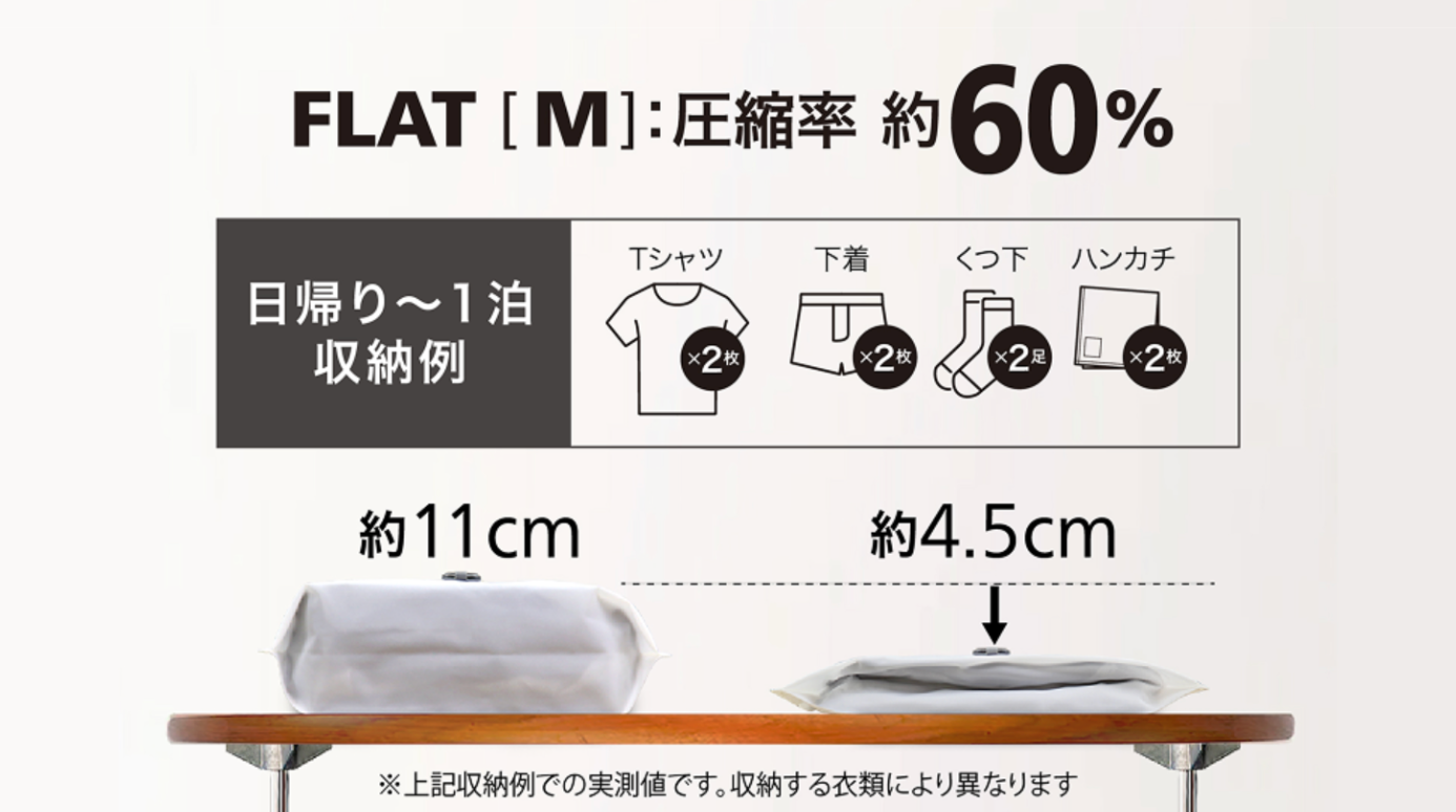 小型・軽量ながらパワフルな専用エアポンプは、持ち運びしやすく機内持ち込みも可能。誤作動を防ぐトラベルロックも搭載し、安全面にも配慮しています。旅先や出張先でもスムーズな荷造りをサポート。衣類を約10秒でスピーディーに圧縮(フラットタイプLの場合)。