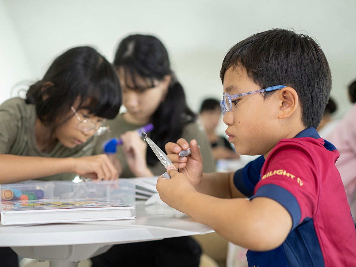 講師の赤羽氏から「自然界には存在しないような鮮やかなカラーや魚の形にエビの模様を描くといったユニークな発想のルアー」も紹介され、子ども達は興味津々。前半の講義で学んだことを思い出しながら、魚や昆虫、恐竜、鉱物、乗り物などのさまざまな図鑑を手に取り、釣りたい魚を思い浮かべながら、透明なルアーに自由な発想で色を重ねていきました。カラフルなペンやシール、スパンコールを使ってポップに仕上げたり、大阪・関西万博公式キャラクター「ミャクミャク」を描いたりと、一人ひとりが想像力を膨らませながら「世界にひとつだけのルアーづくり」を楽しみました。
