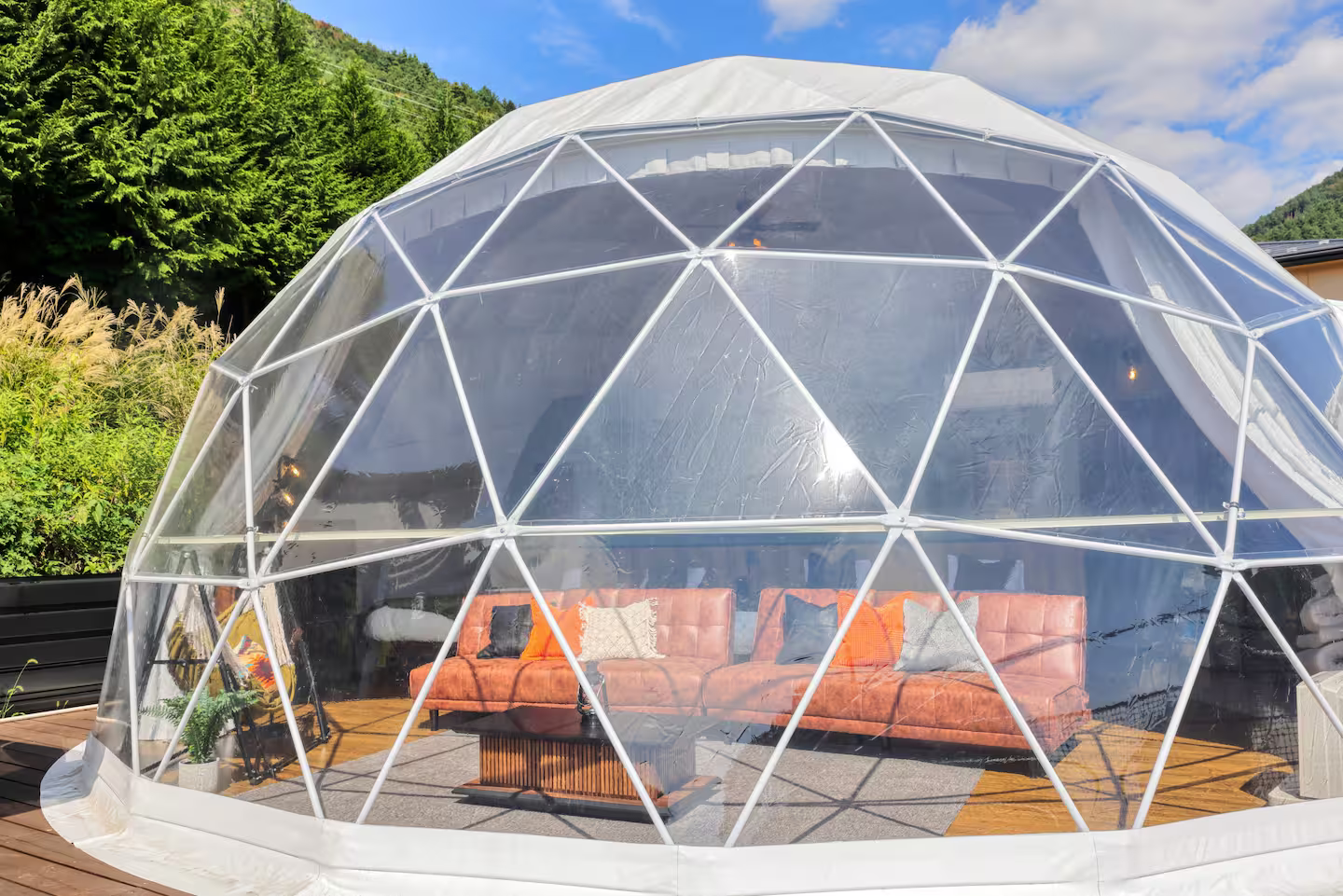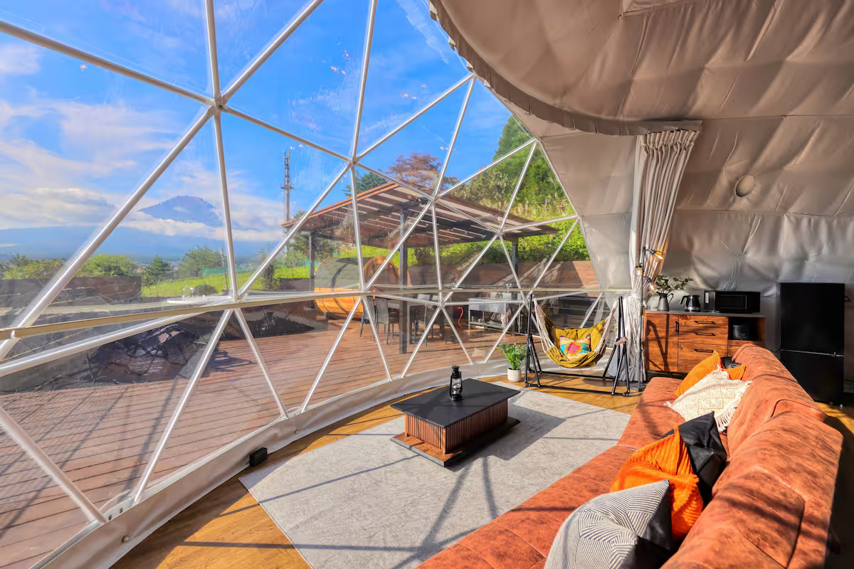 雄大な富士山を望む一棟貸切のグランピングドーム(8mドームテント)です。