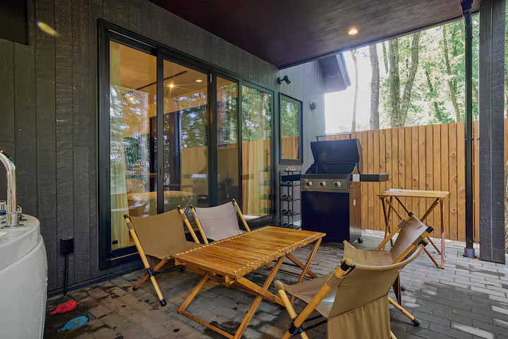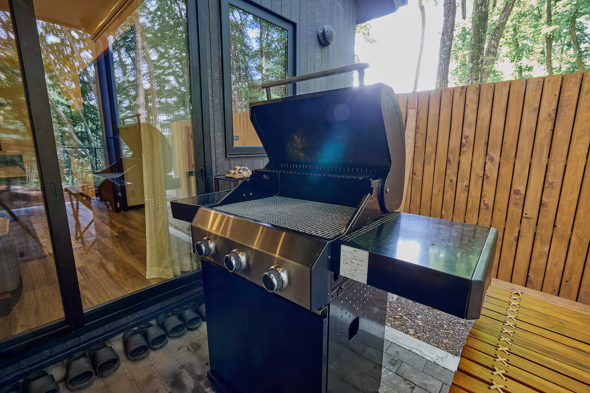 森を眺めながらの外気浴が楽しめる広々としたウッドデッキには、有料のガスBBQグリルを設置しています。