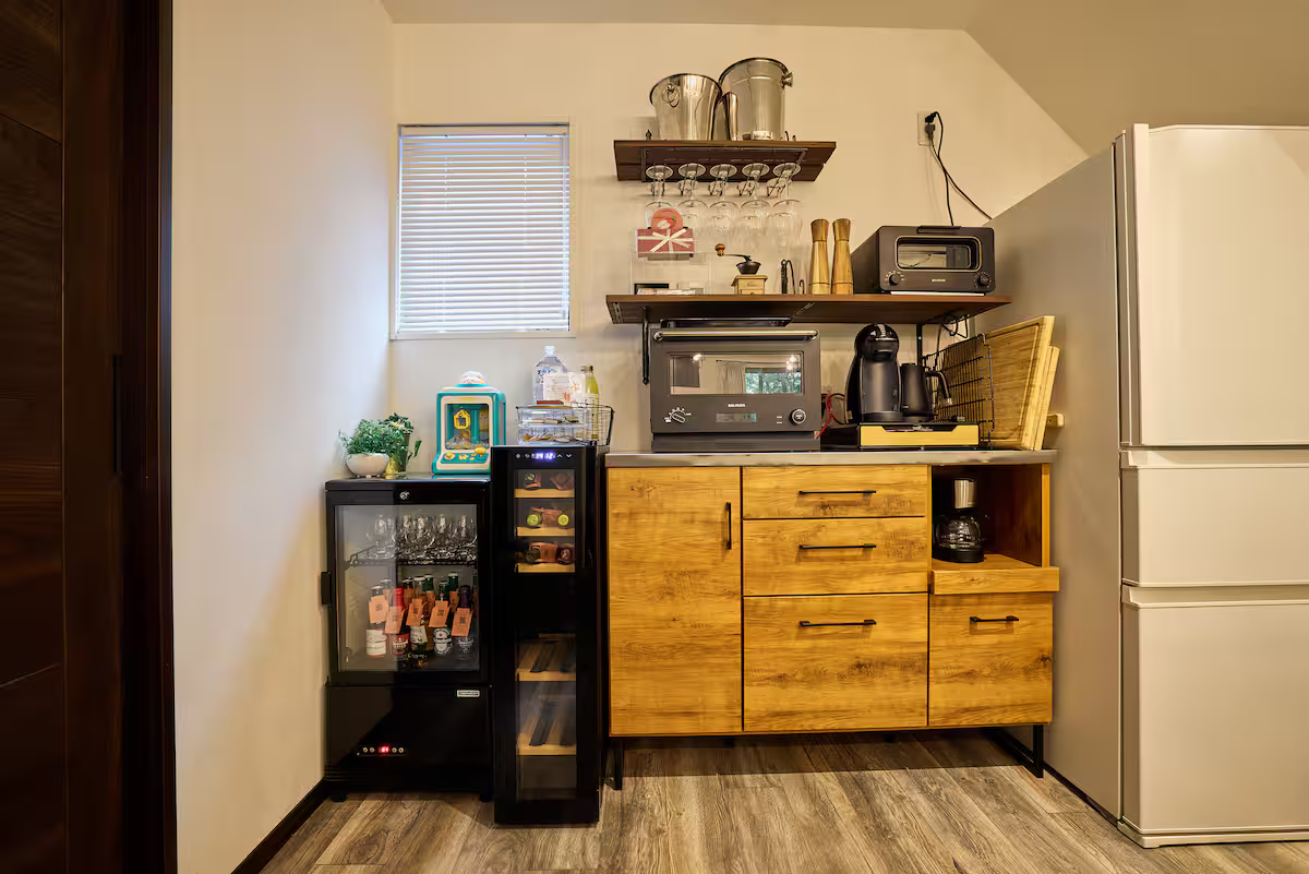 オーブン、コンロ、コーヒーメーカー、トースター、ミニ冷蔵庫、ワイングラス、冷蔵庫、基本的な調理器具、子ども用食器、炊飯器、電子レンジ、電気ポット、食器&カトラリー