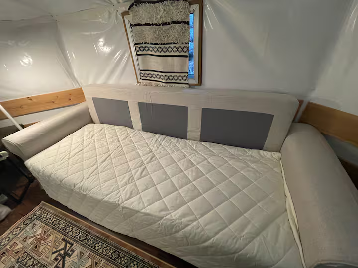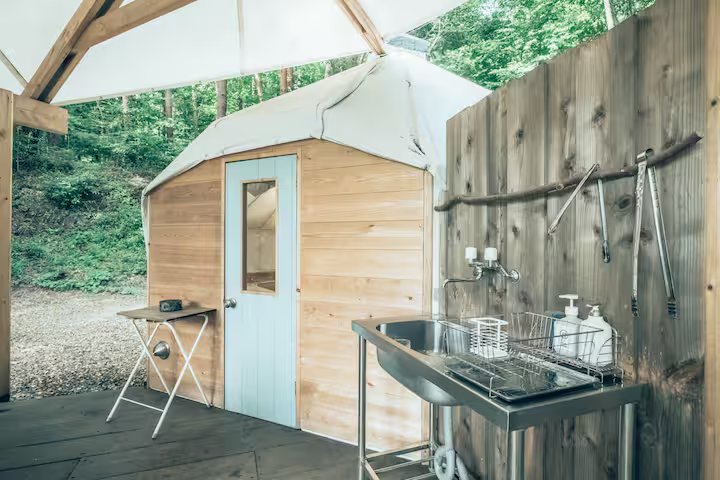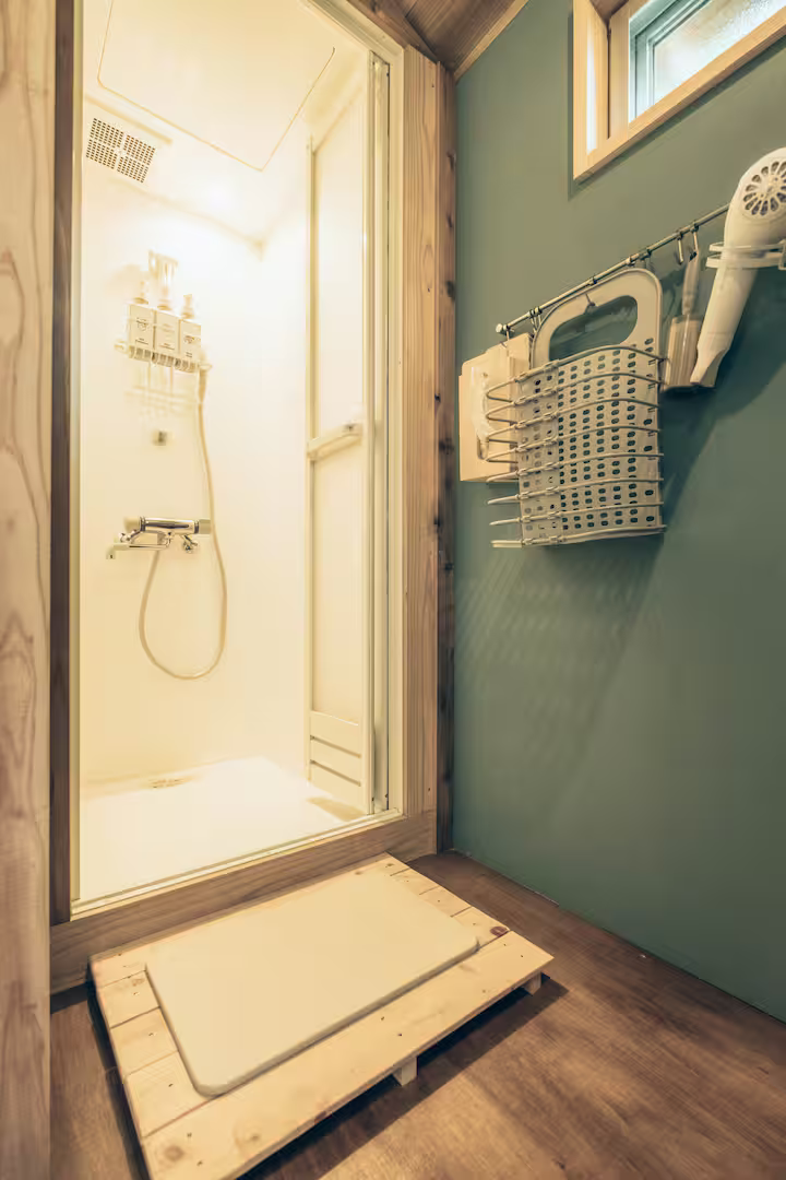 中には冷蔵庫、調理道具一式、エアコン、ストーブ完備。専用のトイレとシンクあり。シャワーは共用のものをご利用ください。