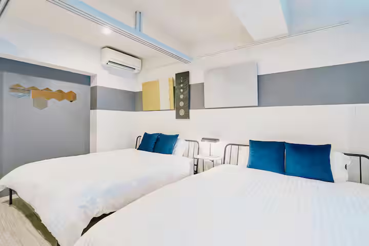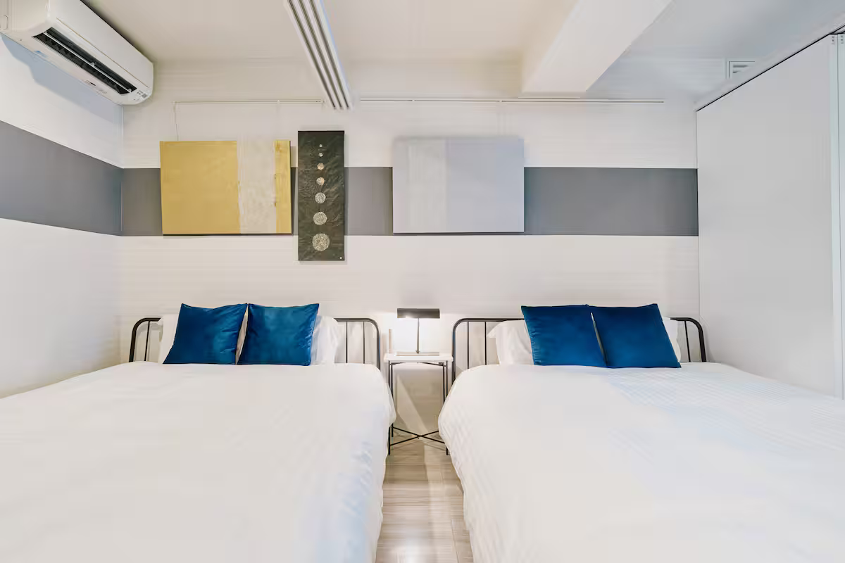 クイーンベッド2台、エアコン、シーツ類、予備の枕と毛布、遮光カーテン、衣類収納スペース、暖房、衣類用乾燥ラック