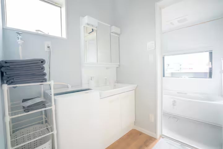 洗面室は洗面台や洗濯機も設置しています。洗濯機は全自動で、5.5kg洗えます。乾燥は浴室乾燥機をご使用ください。