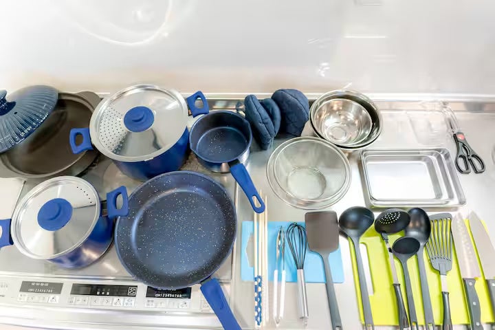 コンロ、コーヒーメーカー、トースター、コーヒー、ベビーチェア、冷凍庫、冷蔵庫、ワイングラス、基本的な調理器具、子ども用食器、炊飯器、電子レンジ、電気ポット、食器&カトラリー