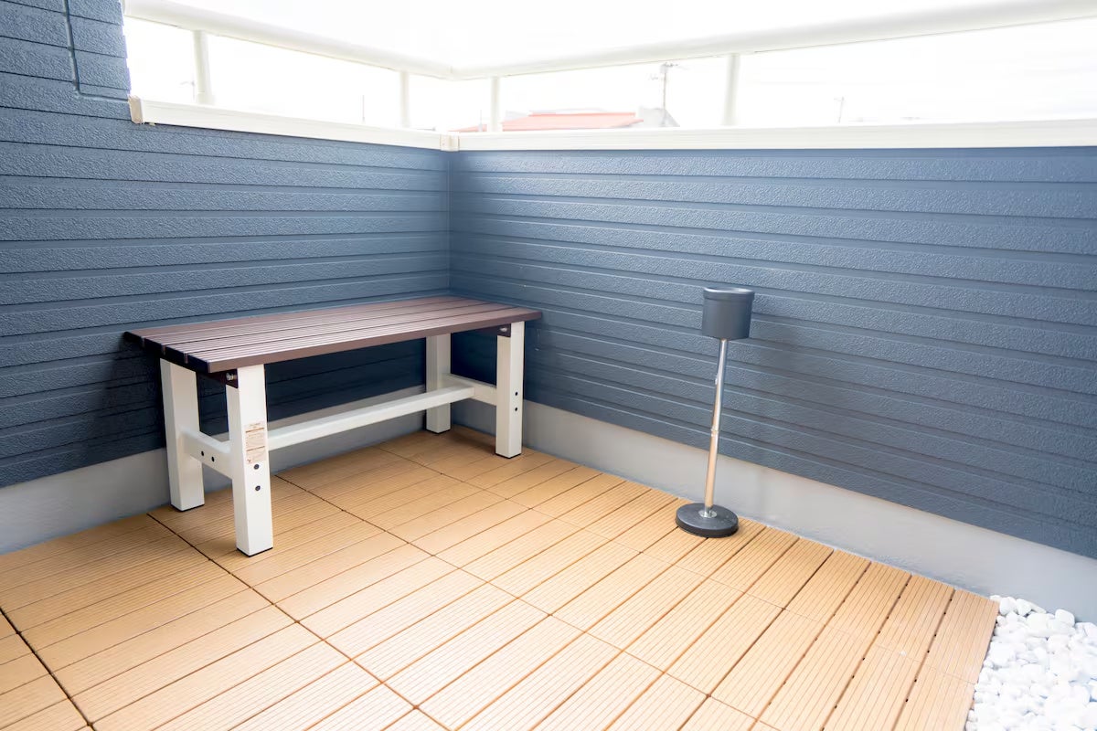 バルコニーでは、ベンチに座り、ゆったりしながら富士山を眺めることができます。晴れた日は日差しを浴びながら、風を感じられて気持ちいいと思います。バルコニーにて喫煙も可能です。