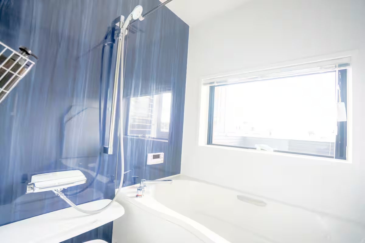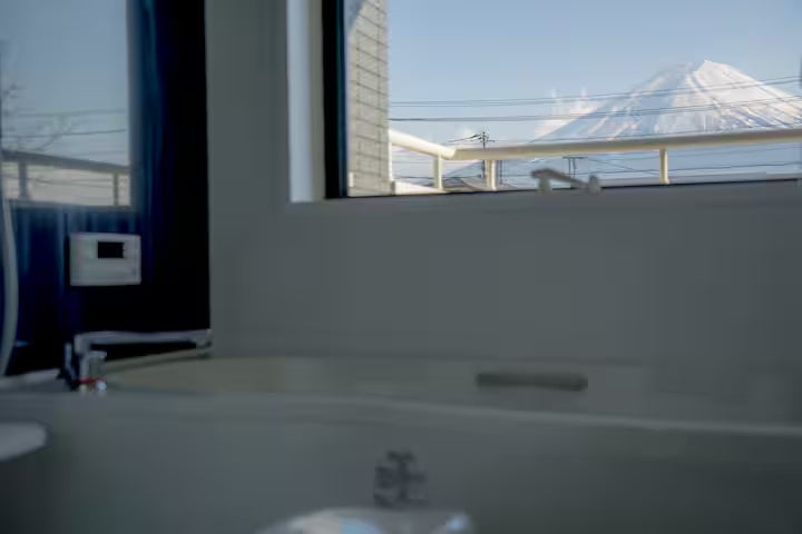 当館のもう1つのアピールポイントは、富士山を望めるお風呂場です。青と白の爽やかな空間から富士山をご覧いただけます。