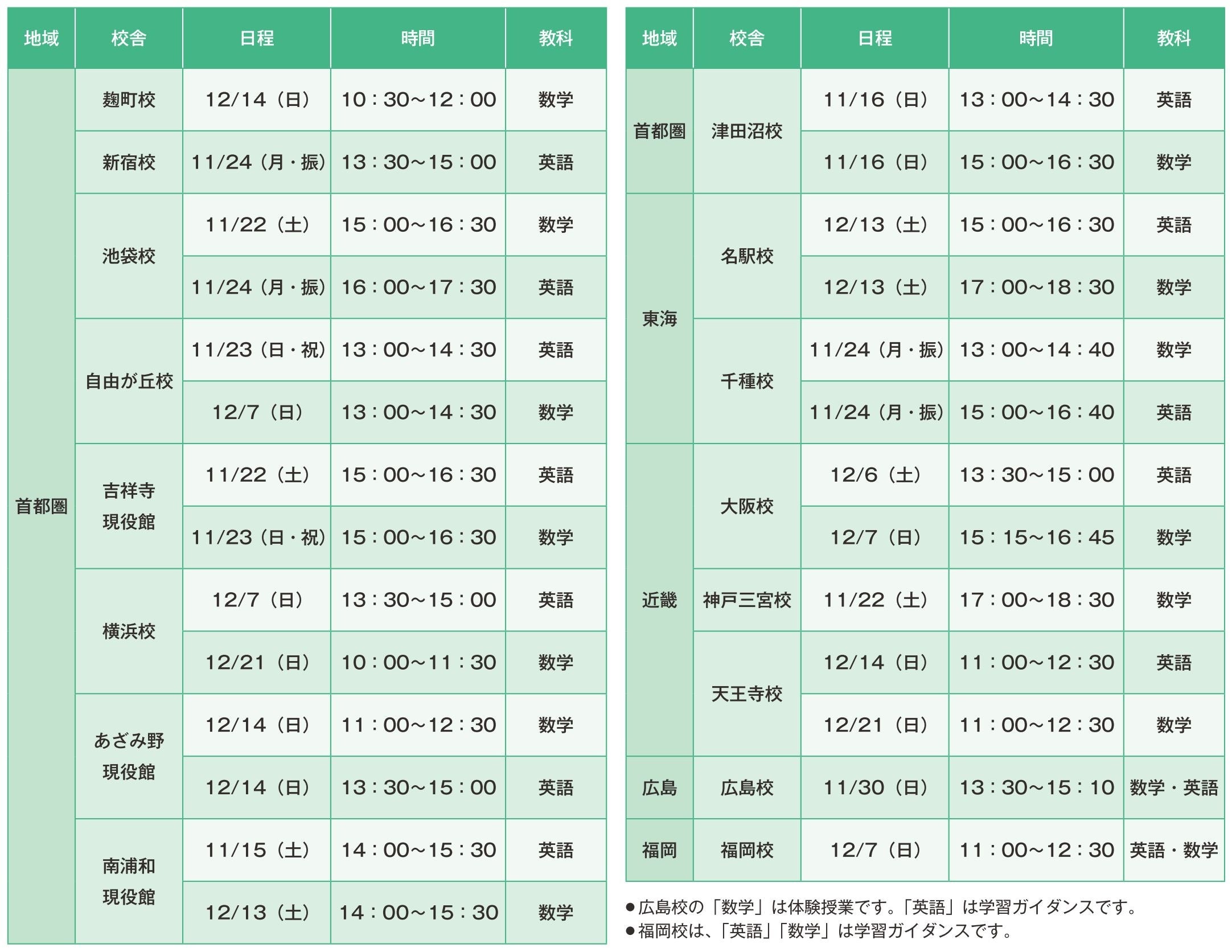 ●校舎・実施日時・教科: