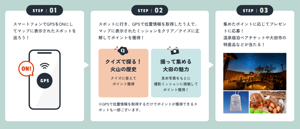 STEP4 集めたポイントに応じてプレゼントに応募!抽選で温泉宿泊ペアチケットや大田市の特産品などが当たります。