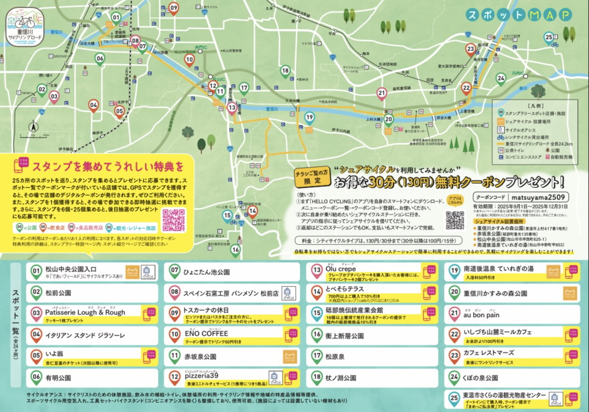 対象スポットは松山中央公園やトスカーナの休日、pizzeria39、南道後温泉ていれぎの湯など、観光・飲食・自然を楽しめる全25ヶ所が設定されています。