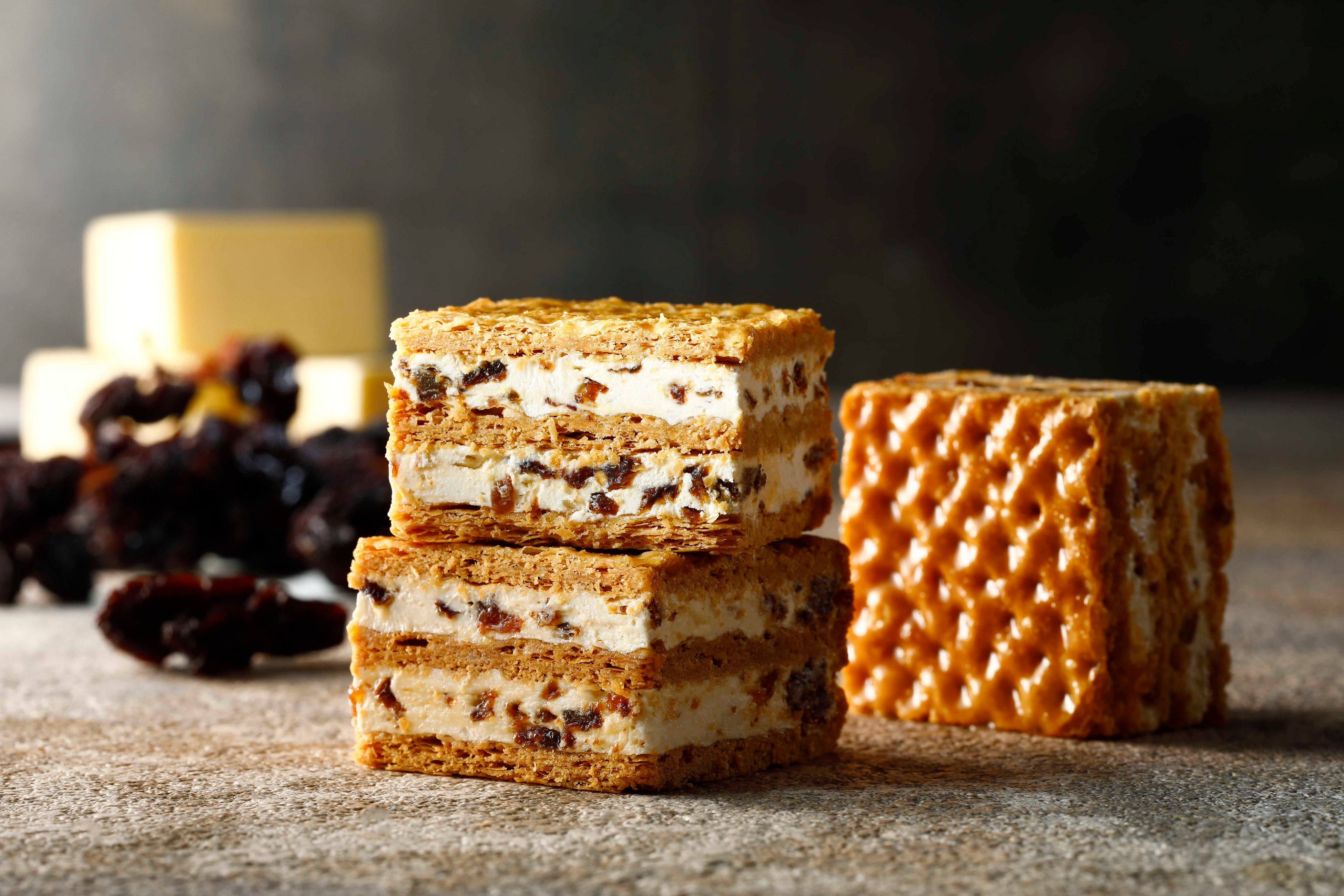 厳選した国産バターを使用した濃く深い味わいのバタークリームに、ラムレーズンを混ぜ込み、さっくり焼き上げた香ばしいパイと重ねてミルフィユに仕立てました。 最高級ディロンラムが味と芳醇な香りを引き立てる、至高のラムレーズンバターミルフィユです。