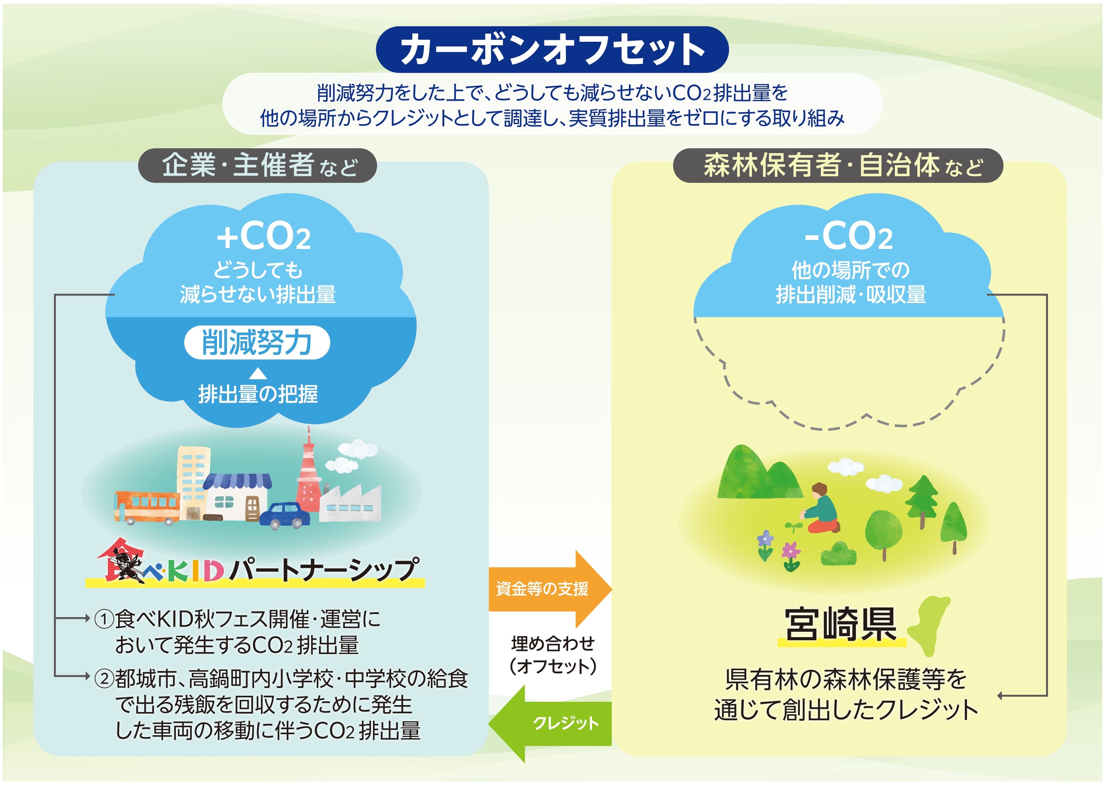 株式会社テレビ宮崎(本社:宮崎県宮崎市)は消費者ひとりひとりの意識改革を促して食品ロスを減らしていく啓発活動『食べKID宣言』を進めており、その取り組みの一環として、2025年10月18日(土)に高鍋町ルピナスパークにて食品ロスについて考えるイベント「食べKID秋フェス」を開催。さらにSDGsの観点から、イベント自体のサステナビリティを目指すために、本イベントの開催・運営および食品ロスに伴い排出されるCO2(詳細下記参照)についてカーボンオフセットを実施しました。