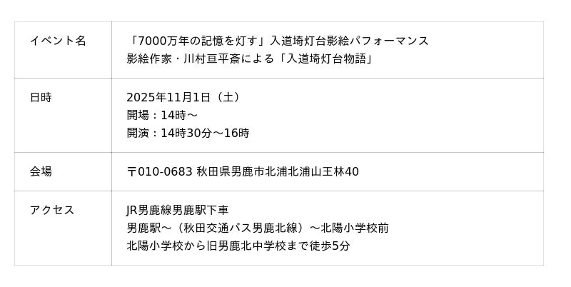 入道埼灯台利活用事業実行委員会は、2025年11月1日(土)影絵作家・川村亘平斎による「入道埼灯台物語」を開催いたします。このイベントは、日本財団「海と日本プロジェクト」の一環として、灯台を中心に地域の海の記憶を掘り起こし、地域と地域、異分野と異業種、日本と世界をつなぎ、新たな海洋体験を創造していく「海と灯台プロジェクト」の助成を受けて実施します。