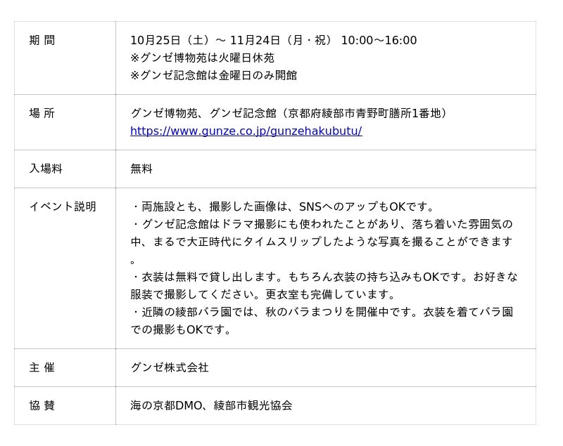 グンゼ株式会社は、2025年10月25日(土)から11月24日(月・祝)まで、「大正ロマン秋のフォトスポット巡り」を開催いたします。本イベントでは、大正時代に建てられた繭蔵(まゆぐら)をリニューアルした「グンゼ博物苑」と、旧本社社屋を活用した「グンゼ記念館」をフォトスポットとして無料開放いたします。
