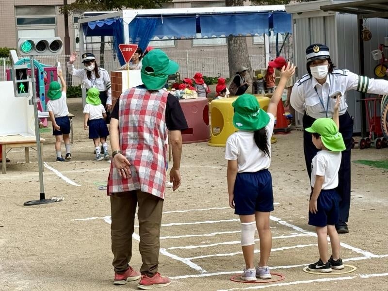 続いて、園庭に移動すると、白線で描かれた横断歩道を手を挙げて渡ったり、信号機や道路標識を使って交通ルールを学んだりと、実際の道路上をイメージしながら学びを深めることができました。