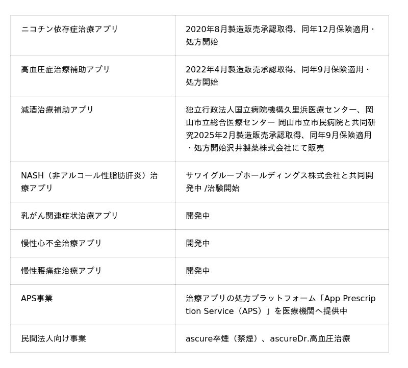 2014年に2名の医師が創業した医療系スタートアップであり、治療効果が治験にて証明され、医療現場で医師が患者に処方する「治療アプリ」を研究開発・製造販売する医療機器メーカー。2020年、スマートフォンで動作する疾患治療用プログラム医療機器として、禁煙治療領域において世界初*の製造販売承認取得および保険適用を実現。高血圧症領域においても、2022年4月に世界初**の製造販売承認を取得し、同年9月に保険適用を受けた。さらに、2025年2月には国内初***となる減酒治療補助アプリの薬事承認を取得。その他、NASH / がん / 慢性心不全 / 慢性腰痛症など、複数の疾患に対応する治療アプリの開発を進めている。