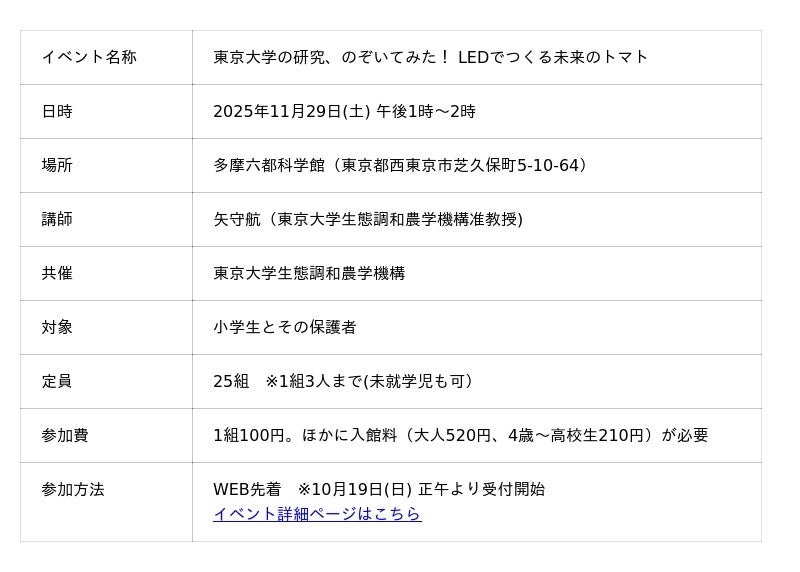 多摩六都科学館(東京都西東京市、館長:高柳雄一。以下、当館)では、2025年11月29日(土)に講演会「東京大学の研究、のぞいてみた! LEDでつくる未来のトマト」を開催します。