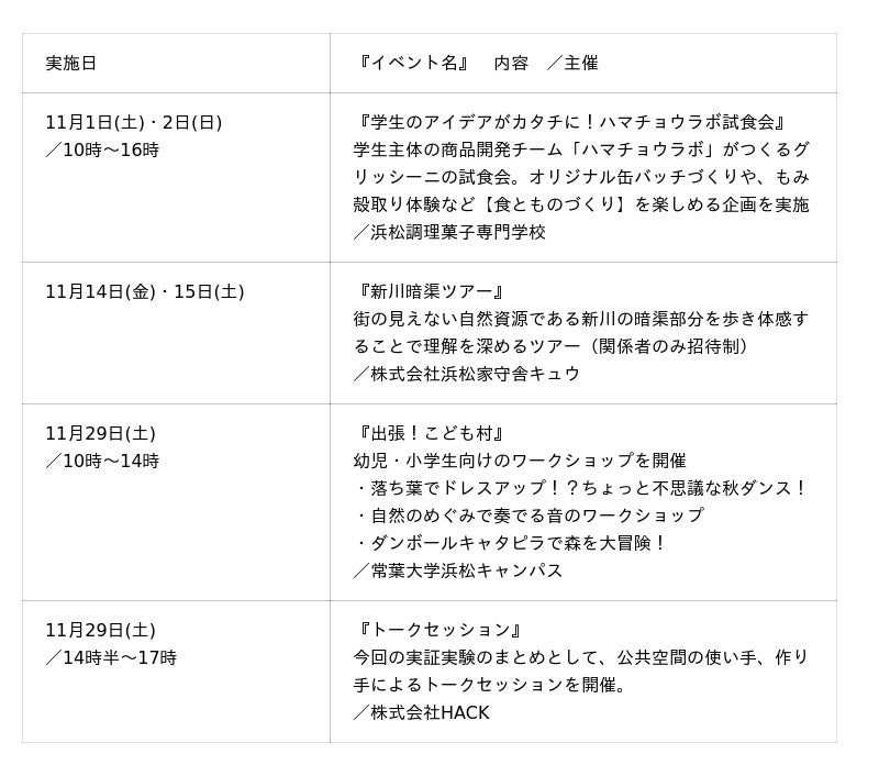 浜松市では、昨年度開催した「まちなか賑わい創出ワークショップ」において提案があった事業を基にし、公共空間「The GATE HAMAMATSU跡地」において、以下の通り実証実験を実施いたします。