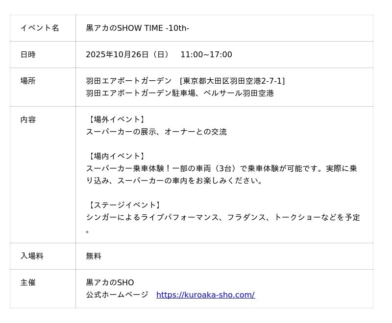 住友不動産商業マネジメント株式会社(本社:東京都新宿区、代表取締役社長:山本 直人)が運営・管理する、羽田空港第3ターミナル直結の複合施設「羽田エアポートガーデン」(所在:東京都大田区)は、昨年に続き今年も、10月26日(日)にスーパーカーの展示イベント「黒アカのSHOW TIME」を開催いたします。