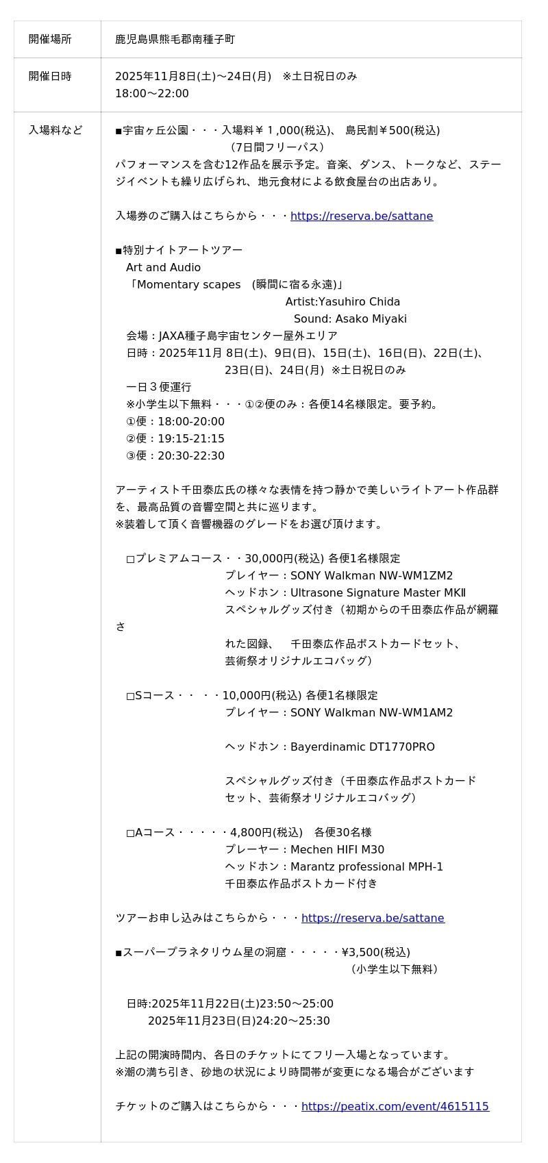 ・宇宙ヶ丘公園入場チケット、特別アートナイトツアーチケット・・・https://reserva.be/sattane