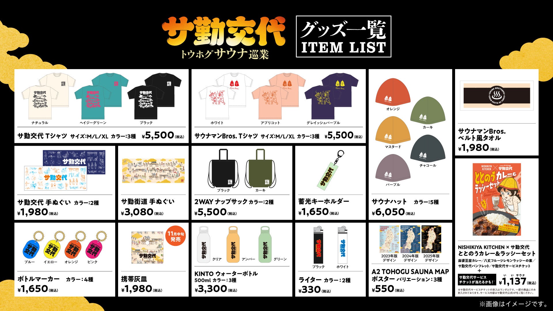 本イベントでは、「サ勤交代」オリジナルグッズを中心に販売いたします。巡回する東北各県のサウナ・ 温浴施設とのコラボグッズも追加制作予定となっております。- NISHIKIYA KITCHEN×トウホグサウナ巡業 『サ勤交代』 ととのうカレー&ラッシーセット
