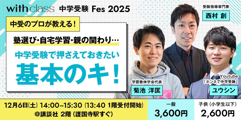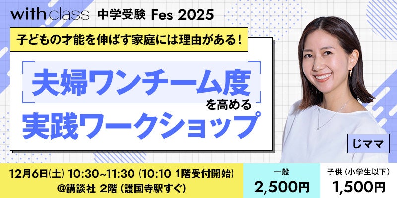 株式会社講談社(本社:東京都文京区、代表取締役社長:野間省伸)が運営する、子育て/教育系メディア「with class」は、2025年12月6日(土)に、中学受験を考える保護者を対象とした総合イベント「with class 中学受験Fes」を講談社(東京都文京区音羽)にて開催いたします。
