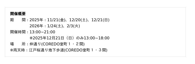 チケット運の向上で知られる福徳神社につながる仲通りにて、推し活アイテムが集合するナイトマーケットや、オリジナルのグッズをつくるワークショップなどを開催。大切な“推し”とともにきらめく冬の日本橋をお楽しみいただけます。
