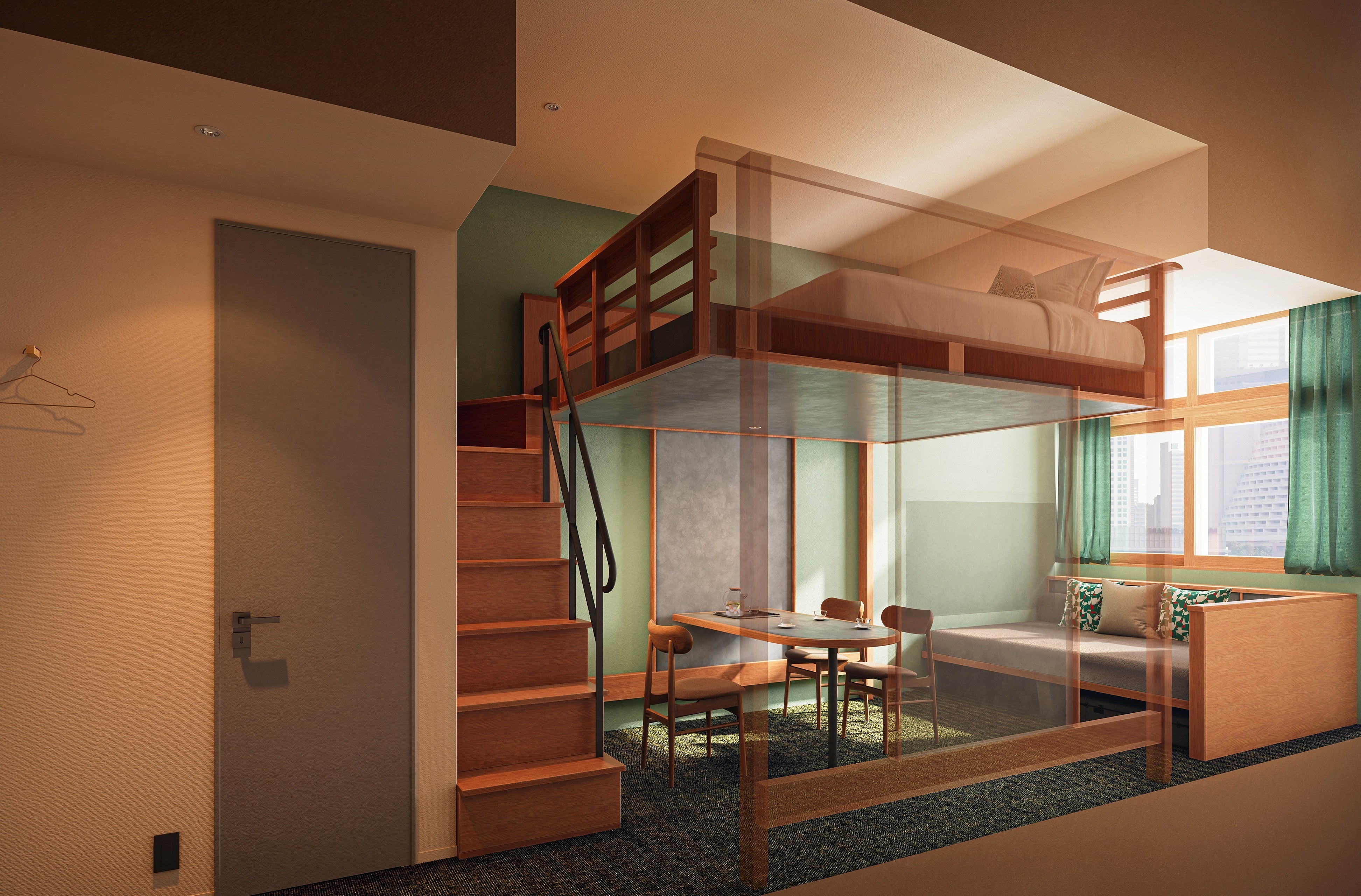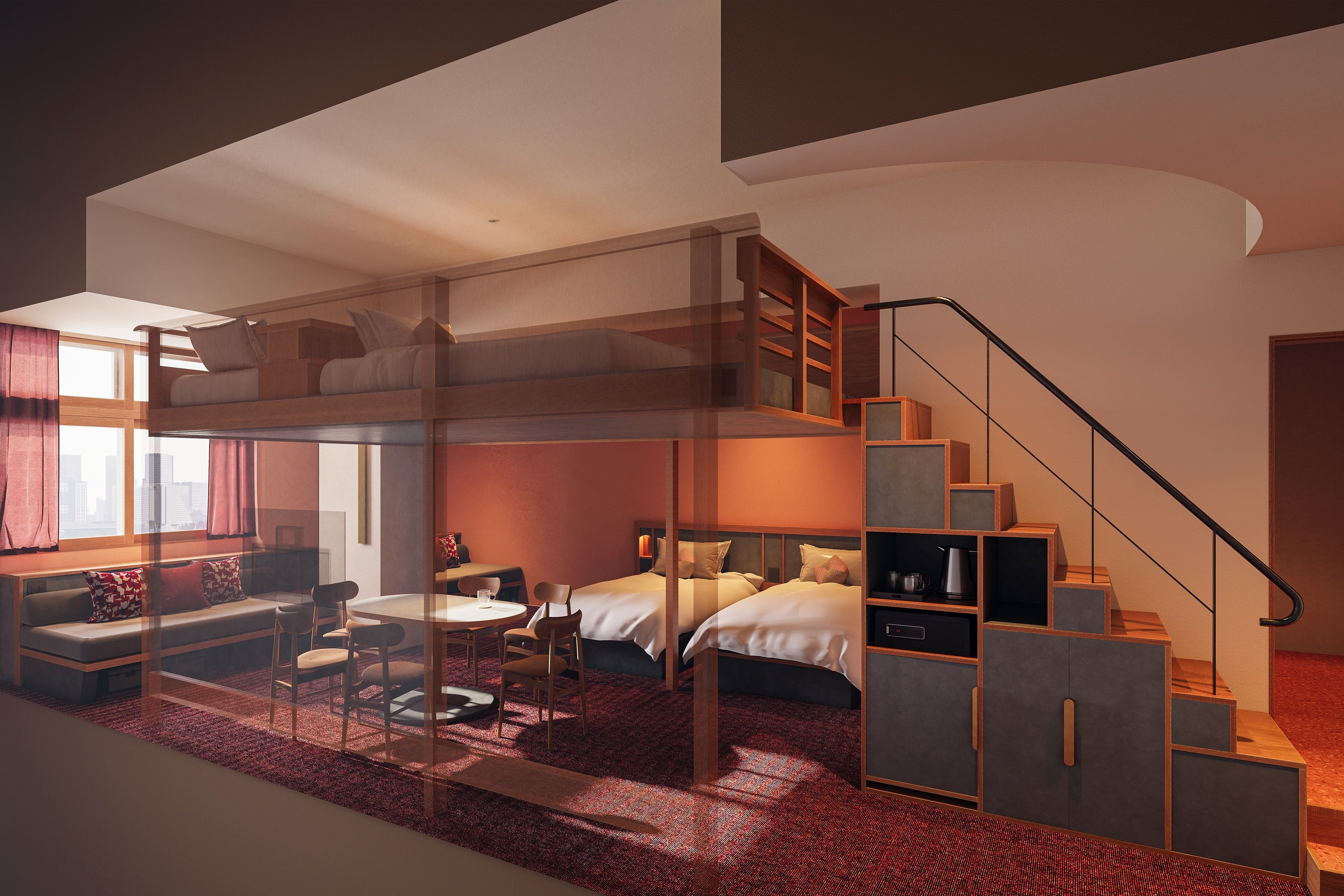 全276室、広さ20平方メートル から73平方メートル の全9タイプを用意。客室のテーマカラーである赤・青・緑は、それぞれ旧市庁舎内で使用されていた色を落とし込んでいます。赤は旧市長室の絨毯の色、青は旧市庁舎内の艶のある磁器質タイルの色、緑は旧市会棟本会議場議員席の色をイメージしています。また、最大6名まで宿泊できる「やぐらスイート」は、広さと高さを兼ね備え、友人グループや家族で利用する際も同じ空間でゆったりと過ごせます。最大4名定員の「かたりばルーム」は、2名で広々と贅沢に過ごすのも良し、4名でソファを囲み、語らいながら楽しむのもおすすめです。そのほか部屋タイプの異なる個性豊かな客室を用意し、旅のシチュエーションごとに選ぶことができます。