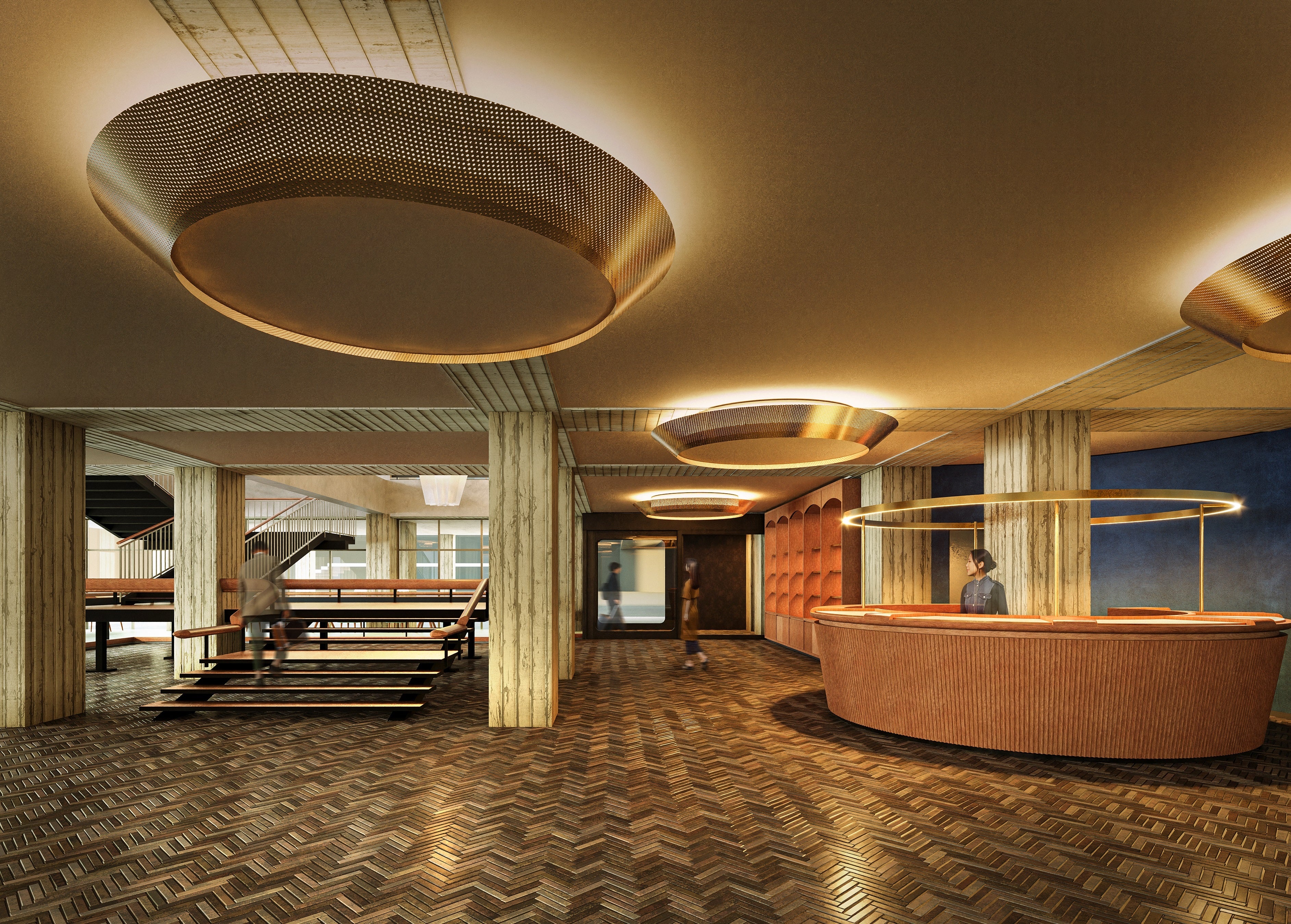 多くの人々の目に触れる1階OMOベースには、旧市会棟本会議場にあった円形照明の要素を取り入れた特殊照明を設置します。照明の光の漏れ方や素材は、新たにデザインし直し、ホテルのエントランスに相応しい高揚感のある雰囲気を生み出します。また、旧横浜市庁舎の象徴的存在でもあった元市民広間大階段のデザインは継承・再構築し、1階と2階を繋ぐ大階段として形成。村野藤吾氏の特徴的デザインである滑らかな曲線を含む手すりの一部も再活用します。